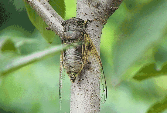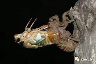 再晚一些,费了九牛二虎之力破土而出的蠽蟟猴,快速地爬上了树干,如果不被捉去,将经历一次艰难的蜕变——固在树干上,身体就不动了,像死去一般。它的身体必须垂直面对树身,因为它的翅膀是靠体液压力而展开的,如果不对称的话就会造成翅膀畸形。先是头部上方开始裂开一道口,然后身体从头到尾慢慢向外钻出来。