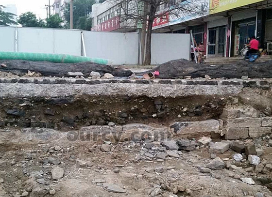 昌邑市城里东街解放路至奎聚路路段修路已有月余。8月8日下午,当修路的工人师傅们在北海公园南门一带挖开路基准备铺设市政管道时,发现路基下竟然藏有整齐的石头墙根。(拍摄:李志国)