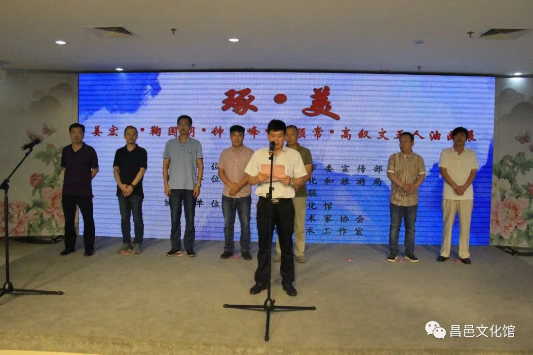 8月16日上午,“琢•美”—姜宏雷•鞠国明•钟鸣峰•刘顺常•高叙文五人油画展在市文化馆开幕,开幕式由市文化和旅游局局长李志国同志主持,昌邑市委宣传部常务副部长代选庆同志致辞,潍坊学院原美术学院院长、教授,潍坊市美术家协会副主席,潍坊市油画学会主席周赤舟同志宣布展览开幕。