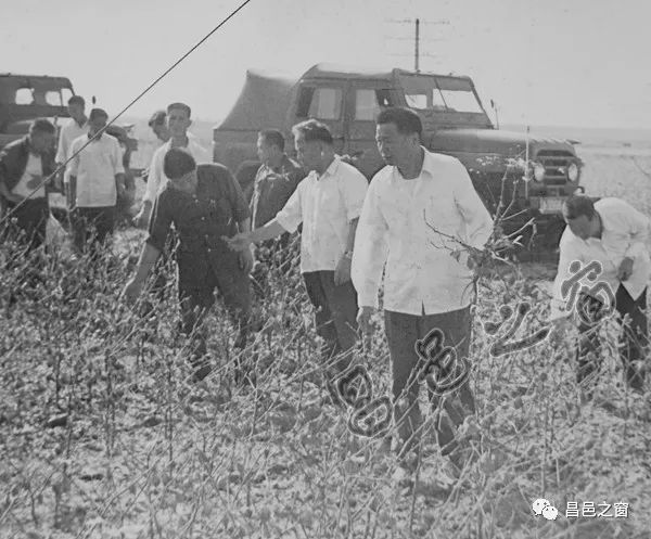 1980年9月1日下午五点四十分,昌邑19处公社除龙池柳疃王耨青乡四处外,有15处公社不同程度遭受冰雹灾害,图为县委书记刘洪仁9月2日到北孟望仙庄查看灾后农田(毕作华摄影)