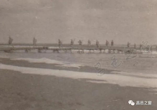 1947年11月,解放军25师74团行军于昌邑北孟一带,部队跨过刘河埠村外小河时旧照。