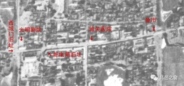 上图为1970年昌邑县革委会投资2万元重修城里街后,解放军总参部航拍昌邑城区影像。西城门旧址位置,当时还是光明剧院,后来拆除,改为果品公司,再后来服装厂扩建厂房,建造沿街车间楼一处。邮电局旧址路口往北正对招待所南门,为老县城最繁华的路口,当时的剧院、饭店、照相馆、理发店、书店、鞋帽店等都集中在这个路口一带。鱼市一带为东城门旧址位置,当时的水产门市部、农机门市部、工商所、草编组都曾在这一带出现过。
