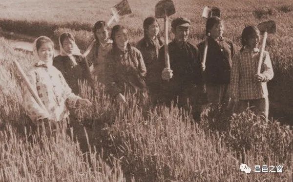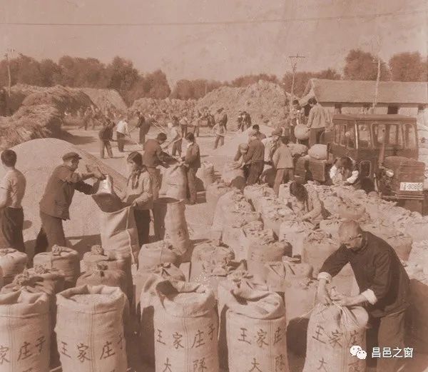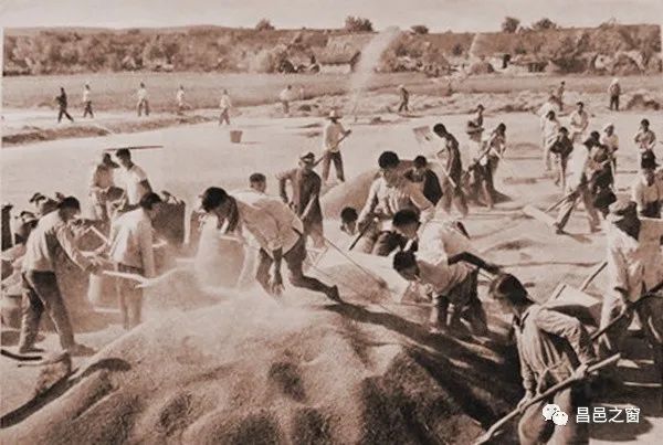 “芒种三日见麦茬”,一般年份“芒种”过后三天人们就开始陆续收割了。后来水肥条件改善,小麦成熟期后延,昌北多数是在六月十二号前后“开镰”。割麦子在所有农活中是最显本事的“把戏”,属“单兵教练”科目。两腿前后分开,脚尖踮地,身子半蹲半弓,顺势前倾,麦子夹在胯腋之间,脚步随着挥镰边割边挪,老百姓形容说是“四䙌子往前挨”。割得快的手脚协调,不慌不忙;割得慢的手忙脚乱,有的累成“呱哒脚”,走起路来两脚平面落地,医学上叫“腓总神经损伤症”。全队三四十人一字排开,两人一伙,前者打约后者捆;孩子们跟在后面捡拾遗落的麦穗;上年纪的老人装车搬运。麦子运进场院,一些不能参加割麦子的中年妇女和小脚老太太,开始梳麦子、铡麦穗、晒场,选择日头毒的中午,用牛拉着碌碡打场。到了六十年代后期,公社有了大型脱粒机,才算是用上了机械化。“十年八年,夏至割完”,大约十天左右时间,小麦全部割完,集中力量突击打场、晾晒、交送公粮。