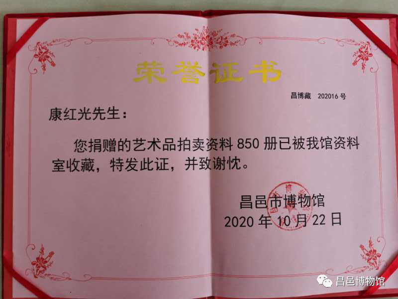 10月22日,康红光先生向昌邑市博物馆资料室无偿捐赠个人收藏的艺术品图录850册,这部分图录印制精美,保存完整,系统展示了近20年来国内艺术品交流的总体成果,后续将作为博物馆资料室的特色收藏予以利用。
