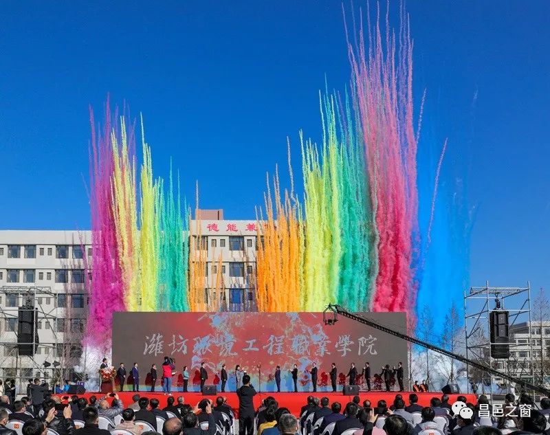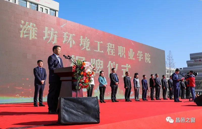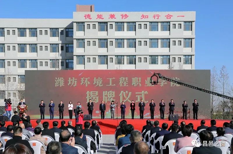 11月9日上午,潍坊环境工程职业学院揭牌仪式在学院中心广场隆重举行。省教育厅职业教育处处长王志刚、潍坊市政府副市长李平出席仪式。潍坊市教育局局长杜全平同志宣读《山东省人民政府关于同意设立潍坊环境工程职业学院的批复》。市委书记吕珊珊出席并致辞。市委副书记、市长李玉祥主持仪式。