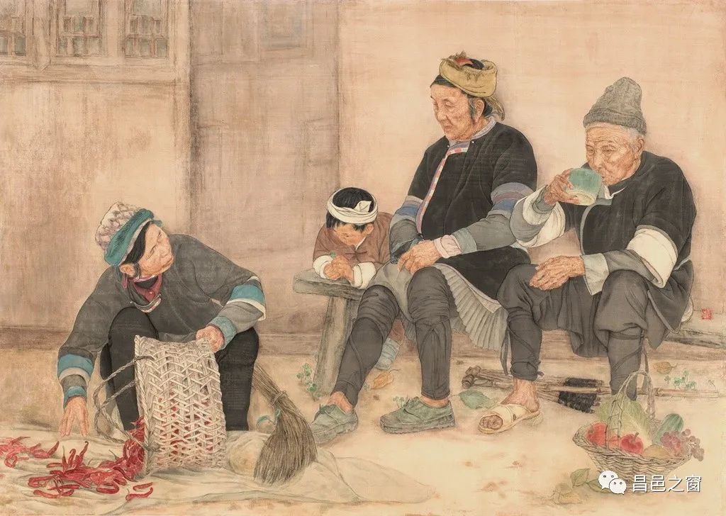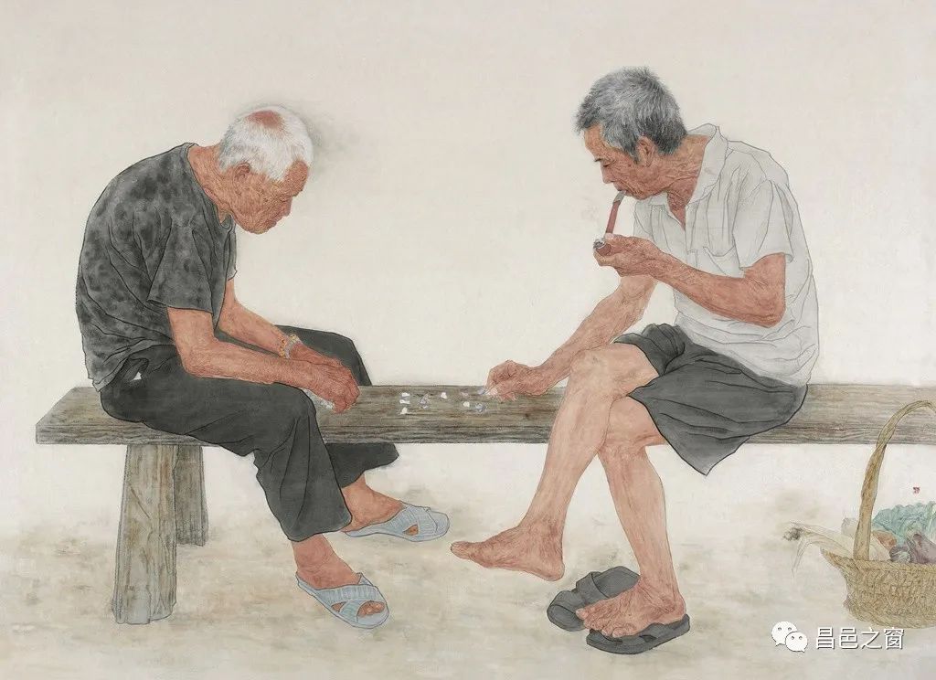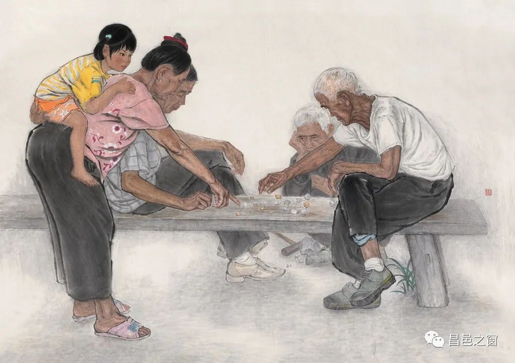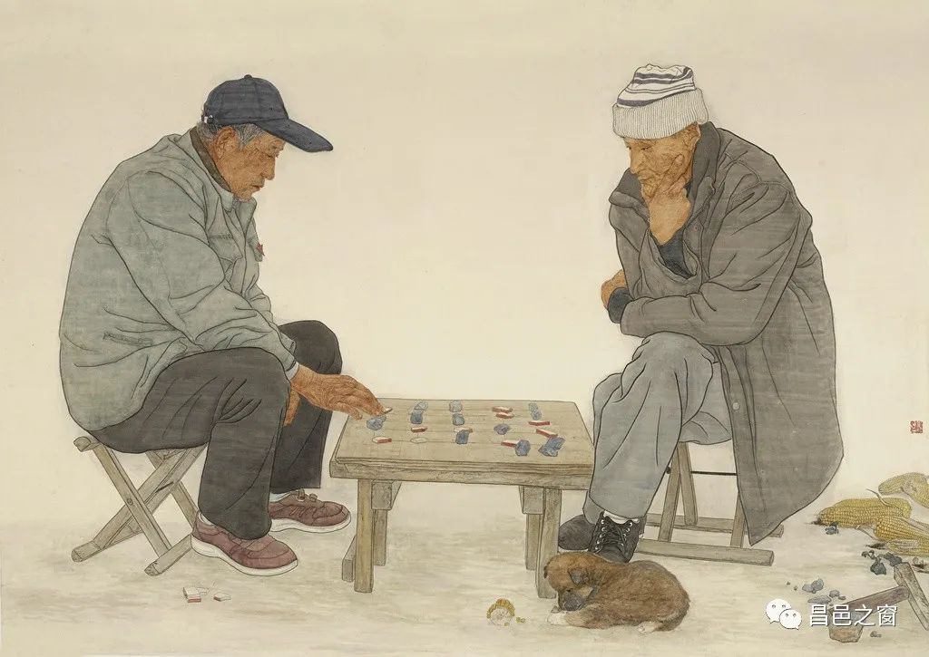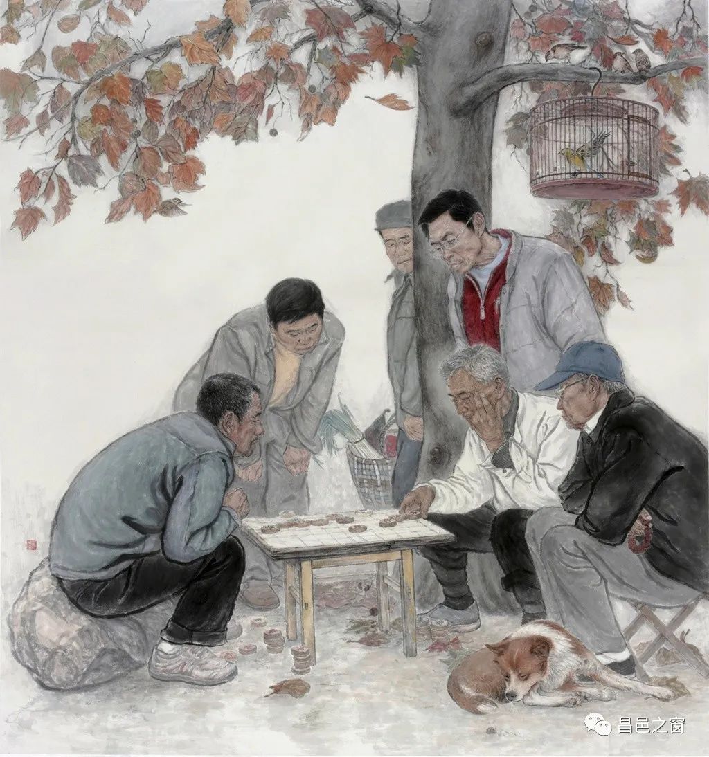 刘鹏辉.《农家生活系列之六-弈会》200cm x 190cm,纸本设色,2017年入选“美在京津冀-纪念改革开放40周年美术作品展览”。