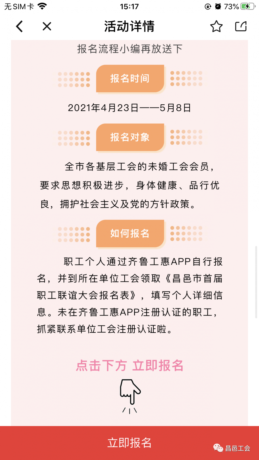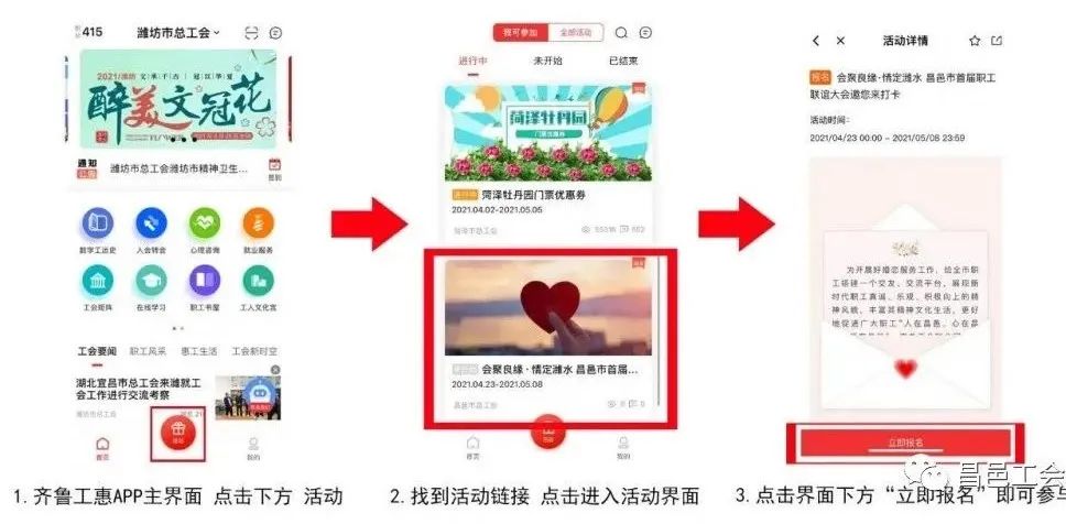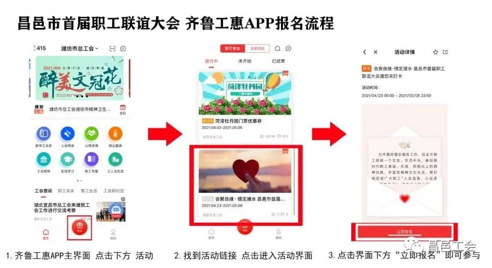 点击文章底部“阅读原文”,进入齐鲁工惠APP活动页面,点立即报名,并到所在单位工会领取《昌邑市首届职工联谊大会报名表》,填写个人详细信息。
