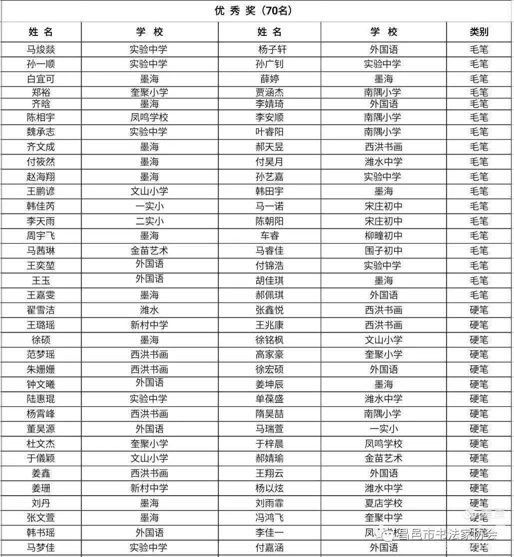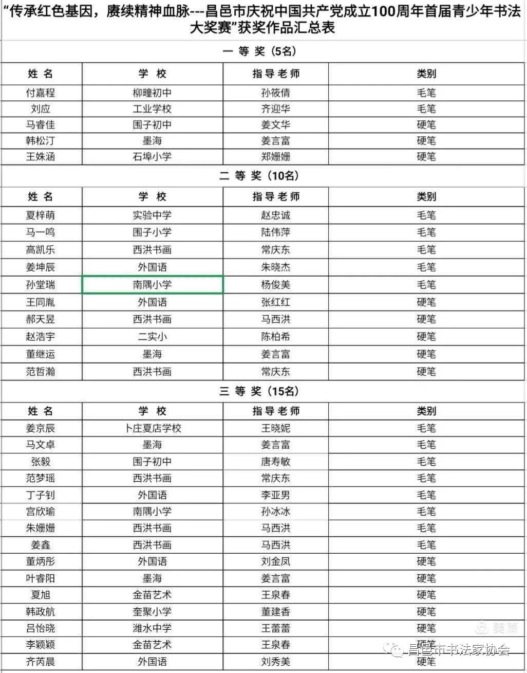 首页 新闻动态 昌邑首届青少年书法大奖赛评选结果公示 昌邑首届青少年书法大奖赛评选结果公示 昌邑之窗 发布于 2021年6月25日 评论(0) 阅读(371) 6月19日,“传承红色基因,赓续精神血脉——昌邑市庆祝中国共产党成立100周年首届青少年书法大奖赛”评审工作在昌邑市档案馆举行 。 本次活动共收到全市中小学生投稿作品998件,经过评委认真细致的评审,经过初评、复评和终评,最终评出一等奖5名,二等奖10名,三等奖15名,优秀奖70 名,获奖作品共计100件。本次活动由中共昌邑市委宣传部主办,昌邑市书法家协会,昌邑市关工委,昌邑市教育局和体育局、昌邑市档案馆共同举办。现将获奖名单进行公示,公示期自即日起至6月26日24时止。公示期间,对上述作者如发现有代笔等现象,可向昌邑市书法家协会和昌邑市教育局和体育局。 举报电话:15053696288 13863630358 附:获奖作者名单 注:其它相关工作另行通知。 昌邑市书法家协会 2021年6月24日