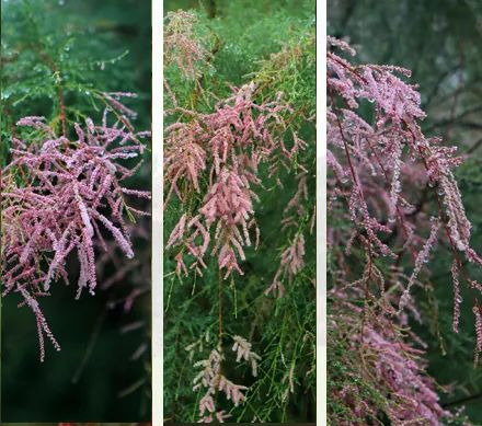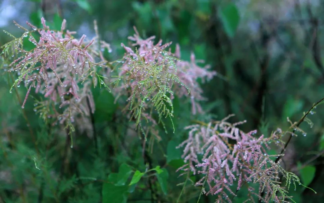 柽柳也叫荆条,三春柳,红柳等,柽柳不是柳,因体态窈窕婀娜如柳而得名。柽柳的树干盛满了流动的时间,生长几十年,也不过小孩胳膊那样粗。柽柳枝条表皮褐红色,枝条细长,多下垂,叶子呈鳞片状,唐代诗人白居易在《有木八章》中,有描写柽柳的诗句:“有木名水柽,远望青童童。根株非劲挺,柯叶多蒙笼。彩翠色如柏,鳞皴皮似松。为同松柏类,得列嘉树中。”诗人表达了他眼中的柽柳之美,夏日的柽柳正值花期,柔芳甚于翠柳,花序为圆锥形粉红色,在枝顶绽放,仙仙的姿态,绵延成花的海洋。