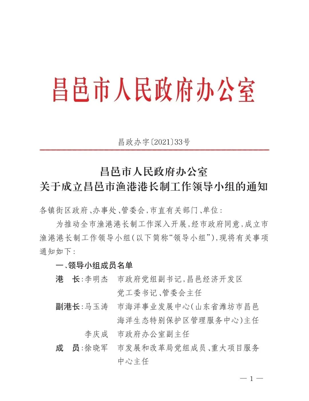 关于成立昌邑市渔港港长制工作领导小组的通知