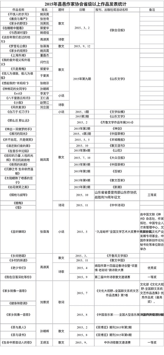 2015年是昌邑作协创作成果丰硕的一年。在这一年里,昌邑作协不断树立精品意识,着力培养人才,多次邀请名家前来指导,开阔了会员的视野,千方百计搭建高层次的展示平台,组织会员团体成功走出昌邑,登上省级文坛,多名会员作品在《山东文学》和《联合日报》集中亮相,获得好评如潮;同时,也有的会员发挥各自优势,在各级报刊发表了高水平的作品并获奖,树立了良好的社会形象。这些成绩的取得,可喜可贺!