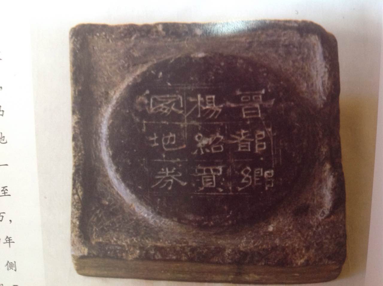 于1982年夏,在山阳村东西大街中段家庙地南侧的王姓人家中发生了一百姓当是小事的事情,六岁儿子雨后在屋后大街的烂石堆玩,他捡回家一块被水流冲击出的黑色方正二十厘米见方的三面有字的石块,正面字较少,中间圆形框内有字,打眼一看就知道是一个印记。上刻"晋都乡杨绍买冢地券",背面刻有"买地一约:东至大泽,西极黄滕,南至山背,北极于湖,直钱二十万,即日交毕,日月为仼。太康四年午月立,永照此券。大吉。"侧面刻有"甲寅三月七日成"。这块石印碑源于西晋晋武帝时的太康四年五月订,而重刻于南北朝时期的甲寅年524年3月7日,杨绍刚八岁的时候。关于弘农华阴的来历,源于史书记载及氏族源流的世代相传,饮马镇是炎黄兄弟的古里,是他们战蚩尤建帝都的地方,也是他们发明道教长寿中医理论及诸多发明的地方,更是他们叶落归根的千古圣地。炎帝也叫农,黄帝还叫大弘,博陆山曾称华山,因此很早就居住在这里的一支杨氏人就称弘农华阴杨氏,现在当地土话就是饮马山阴人。杨震墓原在饮马西南村杨家墓田,他因与昌邑王王密交往有"天知、地知、你知、我知。"的清廉名臣之名,并且他任尚书后蒙冤自杀,传说他的坟前有鸟哀嚎,久不离去,惊动了汉帝,为他平反,后有人把杨震墓迁走重葬以示纪念。这是这支杨氏的骄傲。也是这个早已无人相认的杨氏老墓田,在解放前的当地曾有去老墓田唤冤魂的习俗,相传,在很久以前,不管大人小孩,只要是在傍晚时分去杨家老墓田,用两手挡着嘴巴,大声唤,"呜!呜!呜呜!"不一会就会有冤魂象黑云从墓地中冒出,然后向着在东北方向上的先师湾一带飘,飘到先师湾就总是啪的放个炮一样的消散了。到现在饮马街上老住户,过八十岁的老人都知道这事。