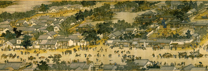 高大的城楼两边倒处是酒肆、茶房、脚店、肉铺、绫罗店、珠宝店、医药店、大车修理店⋯⋯,街道上满眼是轿子、骆驼、牛马车、人力车、太平车、平头车,形形色色,画进了五百五十多个各色人物,车、轿二十多辆,大小船只二十多艘,牛、马、骡等208只动物。然而没有一只狗,一只羊,倒是有一只二人抬着的死鹿。那可都是有道理的,有思想境界的。