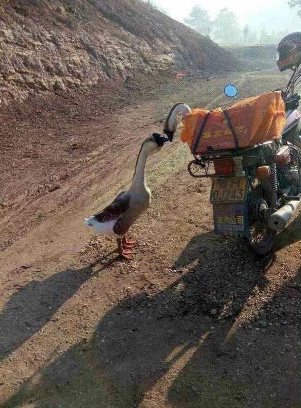 在微信圈里看到这幅画面时,我狠狠的震惊了一下,然后不自觉的就把照片“请”进手机里供起来。当时拍摄者配了“从此一别此生,一个曲项向天歌,一个铁锅炖大鹅……”的字样。就在今天又从微信圈里得知,两只大鹅——包括那只站在摩托车下的公鹅,也没过上“曲项向天歌”的生活,连同母鹅一起成为了村民餐桌上的佳肴,母鹅临死前还流着眼泪。望着叙述者满不在乎甚至略带微笑的脸庞,我想人们都说豺狼虎豹凶猛,其实人类比任何动物都要残忍啊!图中的公鹅在母鹅被绑起来之后,努力用嘴去解过绑住母鹅的绳索,甚至去咬绑母鹅的主人。这种赤裸裸的爱是最真最纯的,也是最崇高的。