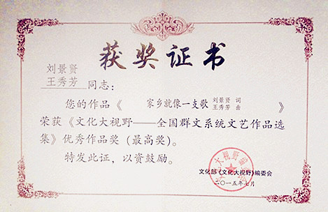 由文化部全国公共文化发展中心主编的《文化大视野--全国群文系统文艺作品选集》第7卷,已由中国文联出版社正式出版发行,我市作协会员刘景贤同志作词的歌曲《家乡就像一支歌》(王秀芳曲)、《健身秧歌调》(杨祖光曲)被收入作品选并双获优秀作品最高奖。