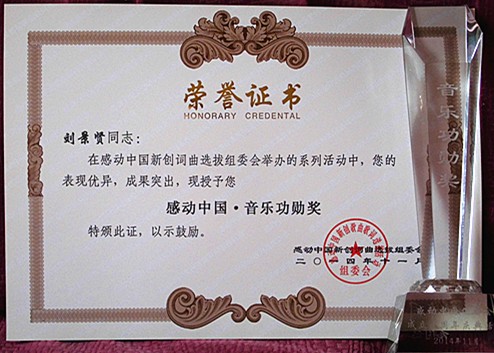 总结表彰,2014年11月1日—4日,组委会邀请全国各地历届获奖的优秀词作家、作曲家代表赴京参加十年庆典颁奖式,共同见证十年辉煌。因我作词的《记者之歌》、《世世代代绣红旗》、《一壶龙吟醉古今》曾在此获奖,应邀赴京。