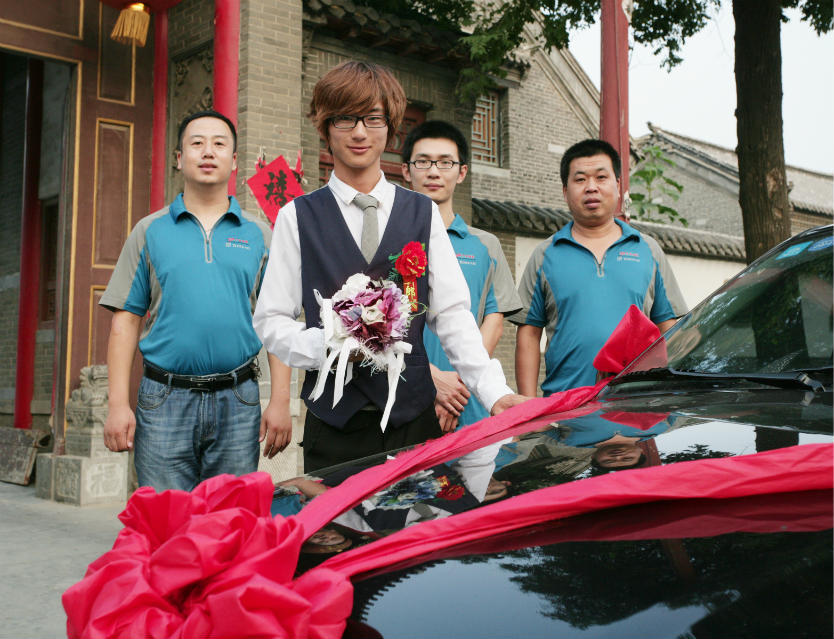 后来我们又谢绝了客户家人留吃早饭的心意,心想利用仅剩的时间回单位小憩一会,明天的活还挺紧!临走之前,据说在韩国留过学的新郎官认真着装,手持鲜花,非要跟我们合个影不可,还颇为讲究的让我们三人站在他后面,说有大爱在身后保护,前程将会一片光明!