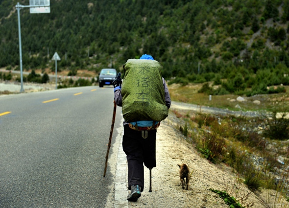川藏路上,一个男人,一条腿,一个拐杖,一个背包,身边一只狗,在山脚下的路边急匆匆地赶路。照片上只是一个背影,一个大大的背包占据了男人的整个背部,那条残疾的腿上木棍一样的假肢裸露在卷起的裤腿外,与手里的拐杖两相呼应,看上去更显得伶仃。身边的狗体形消瘦,一副常年奔波而营养不良的模样,弓起脊背一溜小跑紧跟着主人的脚步,一人一狗奔向同一个方向,却是以各自孤独的姿态在踽踽而行。照片中充满着奔波,艰辛,和生活的困顿,也充满着一种奔向信仰的笃定,和内心坚毅的韧,背包上的“不搭车“让整个画面加重了震撼心灵的冲击力。