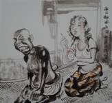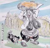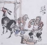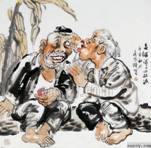 在他的笔下,透着浓郁的草根气息,浸满乡村风情。创作主题依托乡野,故事发自俚情市井,亦庄亦谐,情趣横生。背媳妇、手艺人、老夫妇、酒馆对饮、秧歌嫁娶、童趣,小猫小狗都透着可爱……格调高雅,清新朴拙,夸张不羁,洒脱传神,让人回味无穷又浮想泛滥。是久违的享受,是曾经经历又恍惚遥远的梦境,是不带声像的小品,是独特视角捡回的记忆。