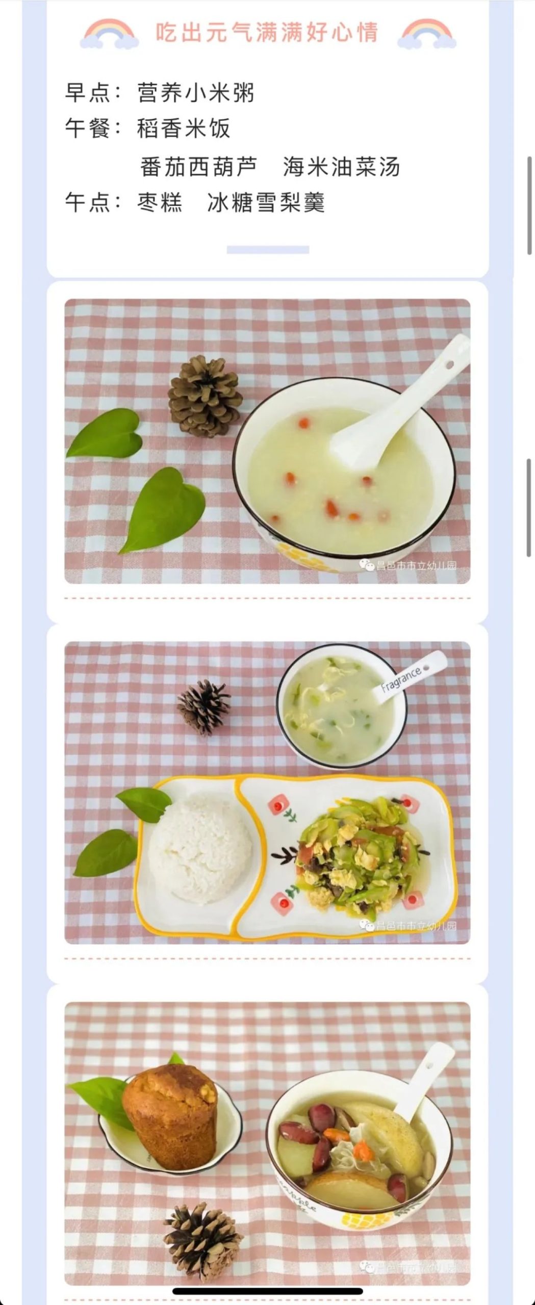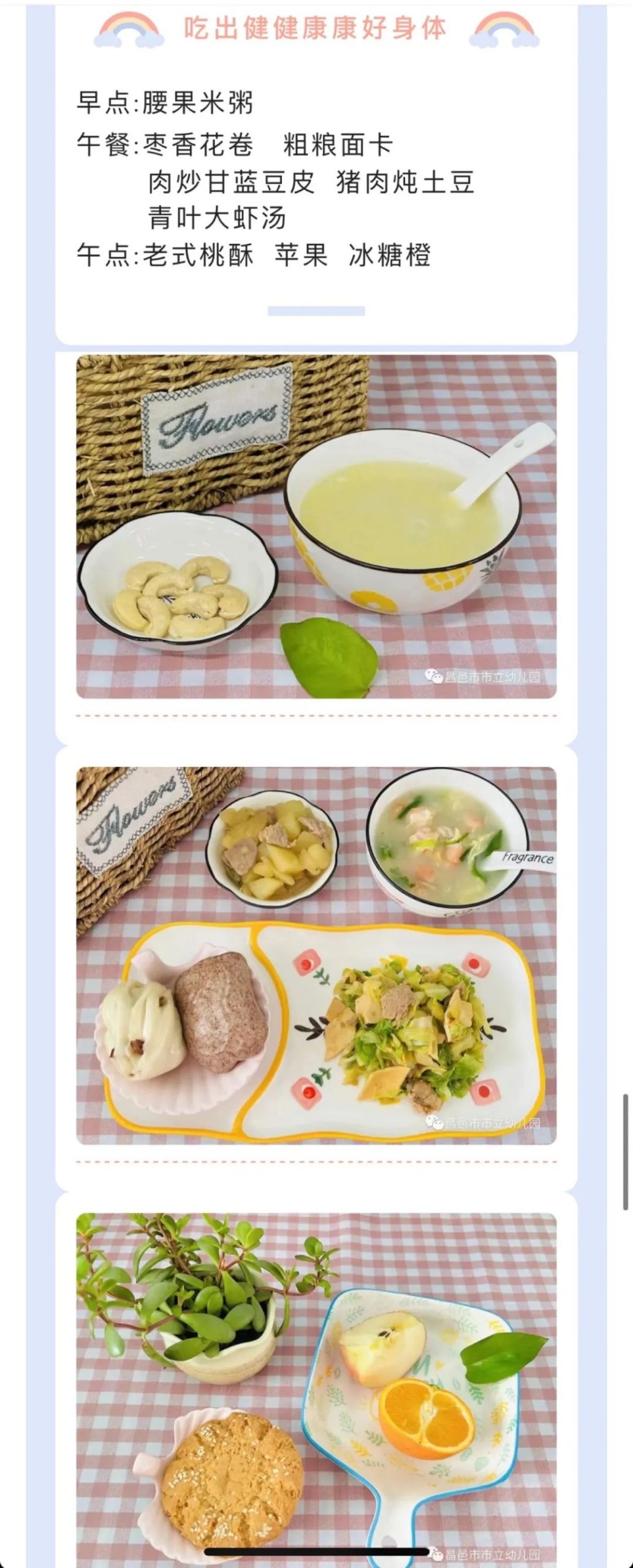 柿子园的美食,让幼儿吃出营养、吃出健康,兼顾色香味美。每周的食谱、每月的“舌尖上的柿子园”,都是出自张爱萍老师为主的柿子园食堂管理团队之手。她经常会跟班里的老师和小朋友们交流,孩子们最喜欢的饭菜是什么?哪类饭菜剩的多?最近这个班里的孩子进食情况少,原因是什么?