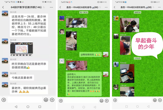 姜老师任26班班主任,班级勤奋学习已蔚然成风。线上授课以来,同学们依然坚持勤学习惯,每天清晨起床学习,姜老师每天和同学们一起早起晚睡,和在学校里一样全程陪伴,虽然相隔一方,但学生们每时每刻都能感到老师的关爱和陪伴。姜老师担任班主任十九年,始终如一,以饱满的热情和严谨的态度对待工作。26班有同学说:“和亦林哥一起上自习,效率高,不走神,心里安稳。”