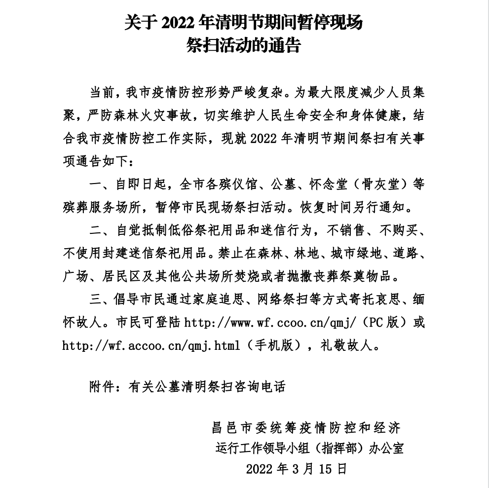 关于2022年清明节期间暂停现场 祭扫活动的通告