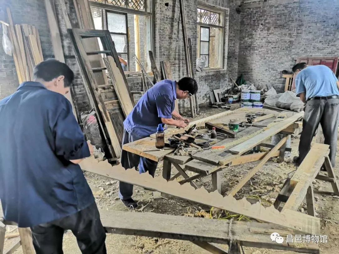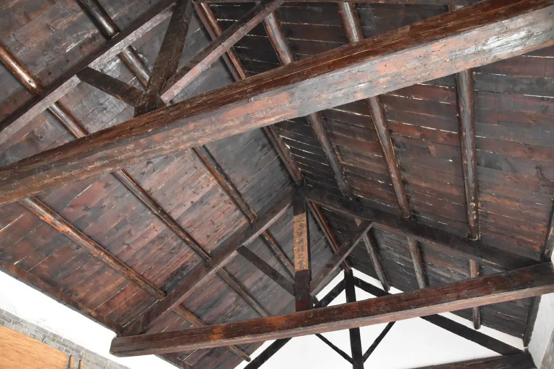 老屋修缮前,屋面形制已经改变,局部坍塌漏雨,建筑前檐披厦和门窗缺失,整个院落已呈风雨飘摇、残破衰败之势。五间正房内,斑驳的墙面已经换成青砖白缝墙,厚0.5米,屋子南北外径8米,明显宽于现在的规划房。修缮时原梁、檩都没有动,梁架上还保留着上梁时的对联,虽然已经过了近百年,对联字迹已经褪色,但完好无损,依稀可辨“万世无疆之业,千载不拔之基”几个苍劲有力的大字,这副对联恢弘大气,尽显昌邑经商人的豪迈气度。