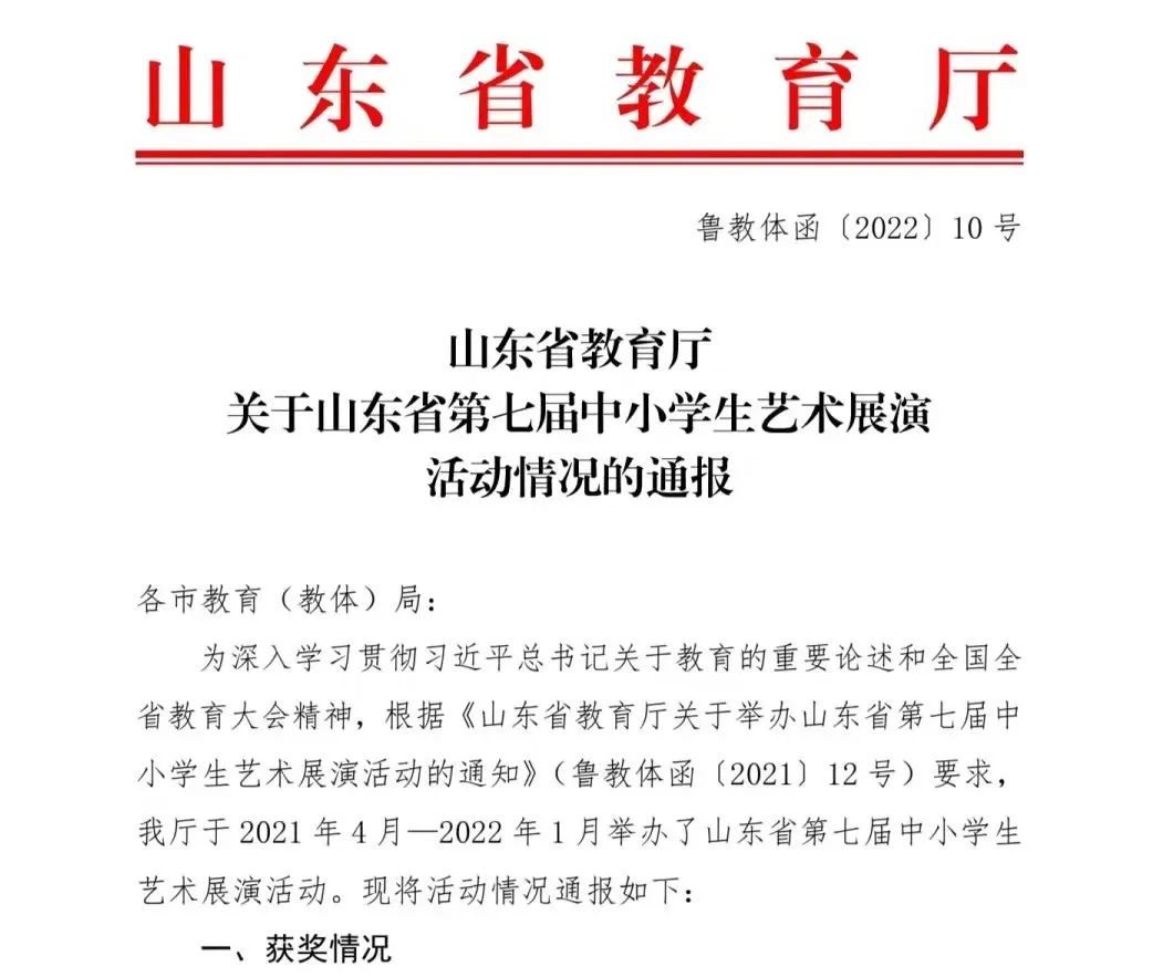 日前,省教育厅发布了《关于山东省第七届中小学生艺术展演活动情况的通报》,我市选报的第二实验小学的朗诵《永远飘扬的红头巾》、文山中学的朗诵《夏明翰的家书》、外国语学校的书法《隶书》摄影《憧憬》、柳疃镇柳疃学区小学的绘画《朱砂荷》、市教科院的美育改革创新案例《全面培养教育体系下的学校美育综合改革实践“—构建全方位美育教学模式”》获奖,获奖数量为潍坊县市最多。