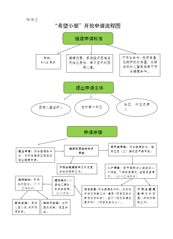 2.入户调查。团市委对镇街区团组织递交的援建申请进行第二遍信息审核,并联合相关公益组织到提出申请的困境儿童家中进行入户调查,重点查看服务对象家庭环境和居住空间,了解房屋安全、监护人的房屋合法处置权、服务对象及监护人对建设“希望小屋”的意愿等。经实地走访调查,符合援建条件的10天内做好信息采集工作,不符合援建条件的10天内给予不能援建答复,并做好相关解释工作。