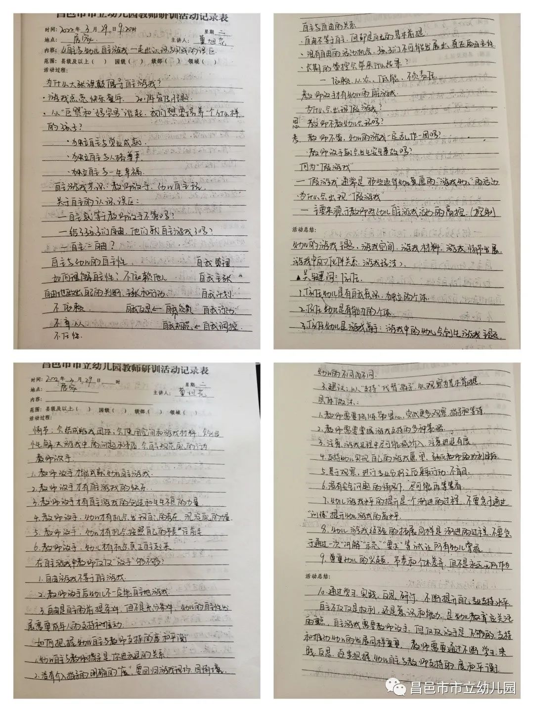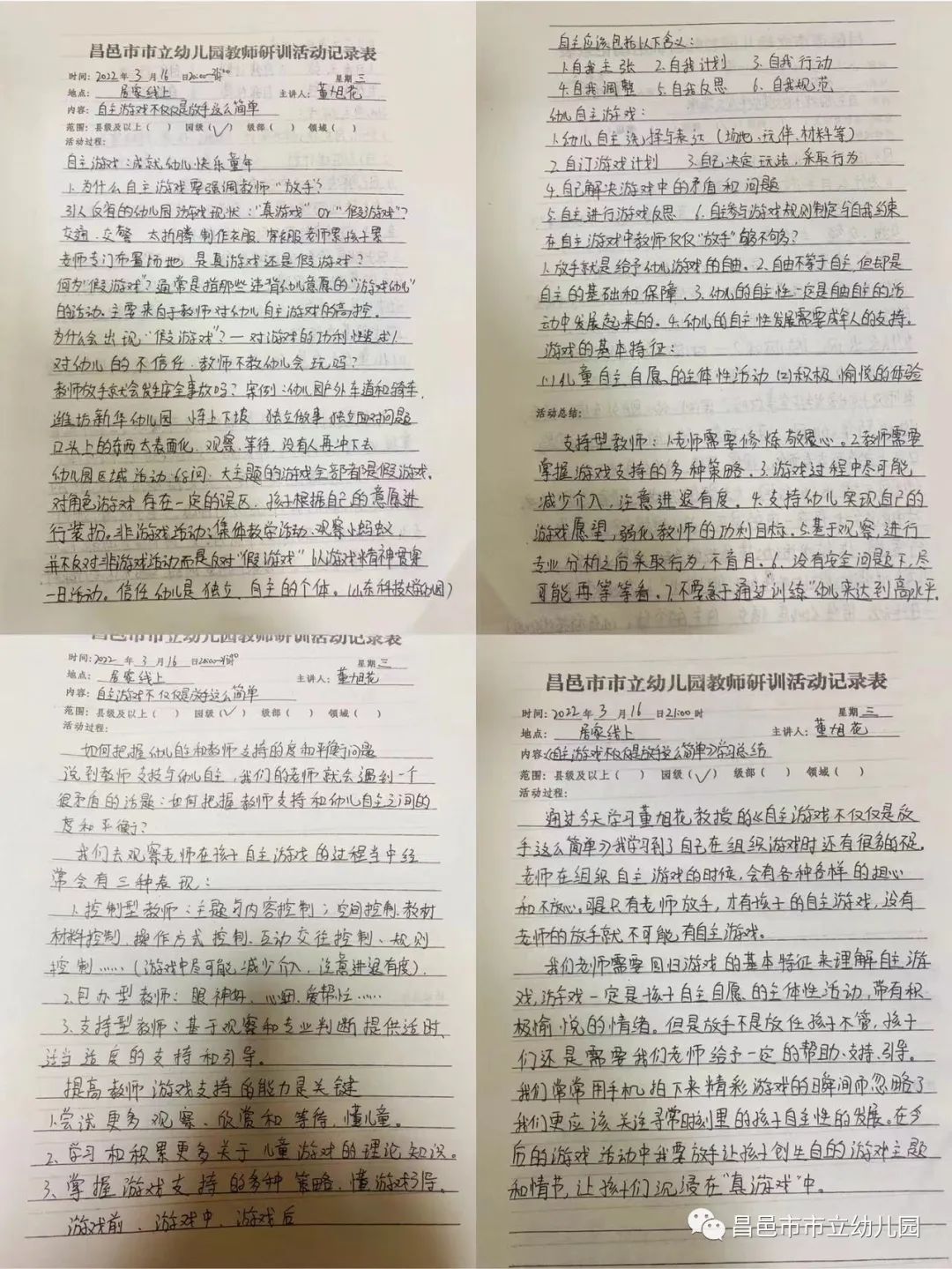 3月16日晚,全体教师观看了《自主游戏:不仅仅是“放手”这么简单》;3月29日上午,学习《自主与幼儿自主游戏:走出认识与实践的误区》讲座,在说与听、思与研的过程中,教师不断成长。
