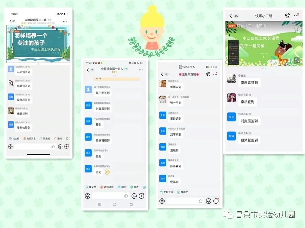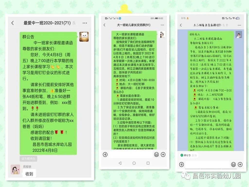 各分园制定了课程实施计划,各级部、各班级根据幼儿的年龄特点确定课程主题,老师们提前集体研讨并备课,撰写发言稿、制作PPT,并提前在微信群发布了家长课程的邀请信息,以确保线上家长课程的顺利进行。
