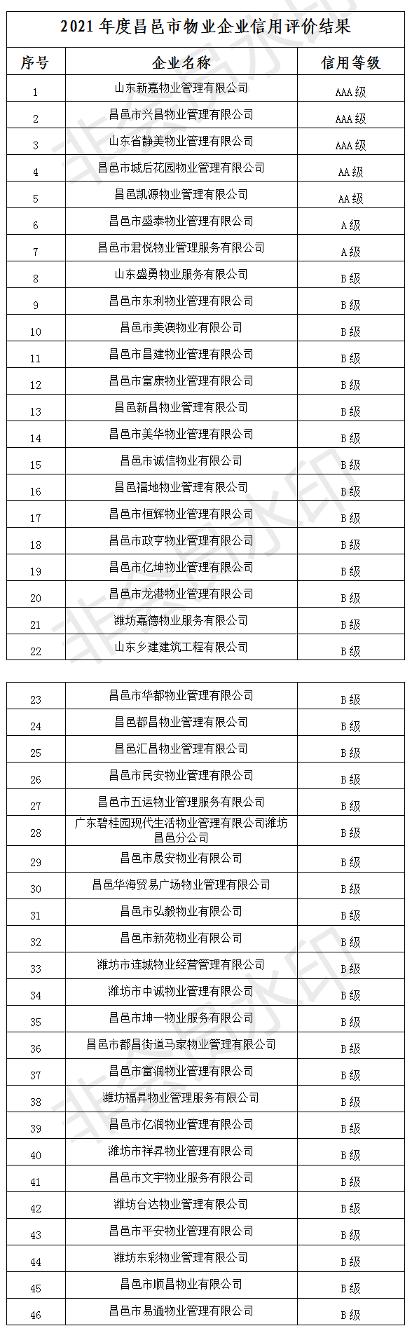 为进一步加强行业监管,规范物业服务市场秩序,提高行业诚信度和服务水平,促进物业服务市场健康有序发展,根据《潍坊市物业服务企业信用档案管理办法》开展了2021年度信用评价工作。现将评价结果予以通报:
