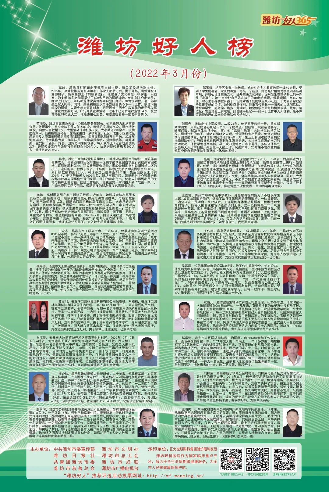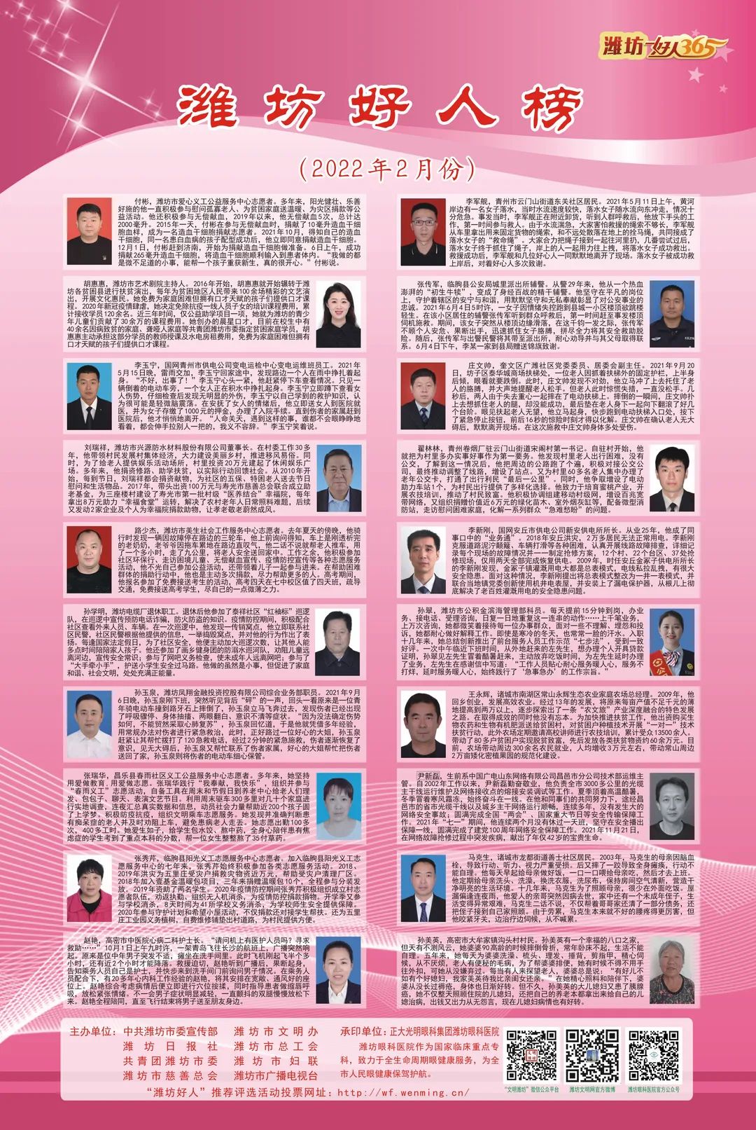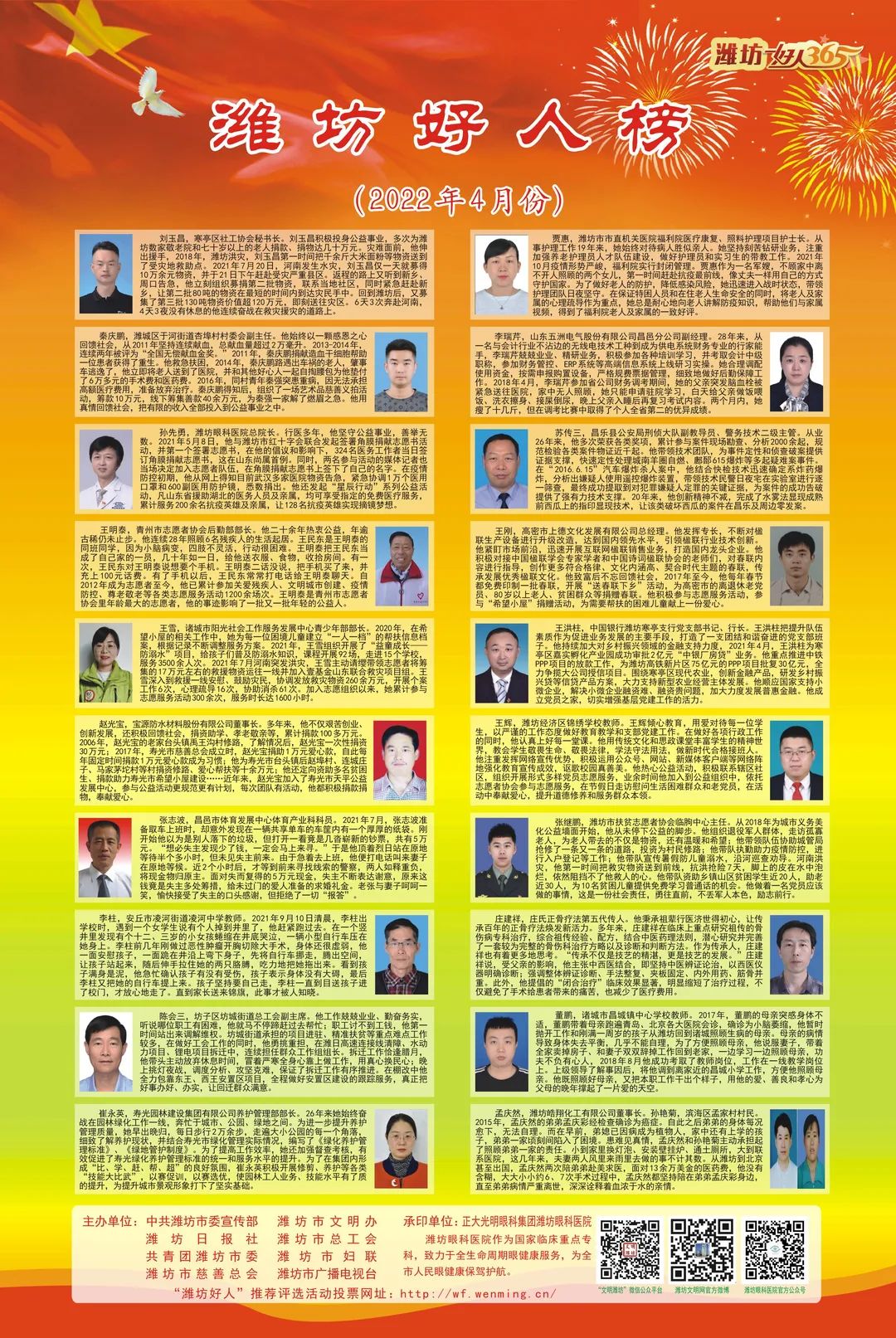 经网络投票及推荐评选活动组委会(潍坊市委宣传部、潍坊市文明办、潍坊日报社、潍坊市总工会、共青团潍坊市委、潍坊市妇联、潍坊市慈善总会、潍坊市广播电视台)的评选,胡惠惠、李玉宁、路少杰、孙学明、张瑞华、张秀芹、赵艳、孙玉泉、付彬、刘瑞祥、李军舰、张传军、庄文帅、翟林林、李新刚、孙翠、王永辉、尹新磊、马克生、孙美英20人入选2022年2月份“潍坊好人榜”;高峰、苟增委、韩冰、姜敏、王宏志、张海涛、贾文利、刘楠楠、刘海港、杜介勋、郎玉梅、刘振升、聂鹏、王连霞、王作起、吴磊磊、衣魁元、赵常海、郝树明、刘振荣、王明秀21人入选2022年3月份“潍坊好人榜”;刘玉昌、秦庆鹏、孙先勇、王明泰、王雪、赵光宝、张志波、李柱、陈会三、崔永英、贾惠、李瑞芹、苏传三、王刚、王洪柱、王辉、张继鹏、庄建祥、董鹏、孟庆然、孙艳菊21人入选2022年4月份“潍坊好人榜”。
