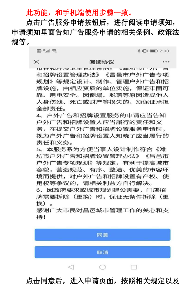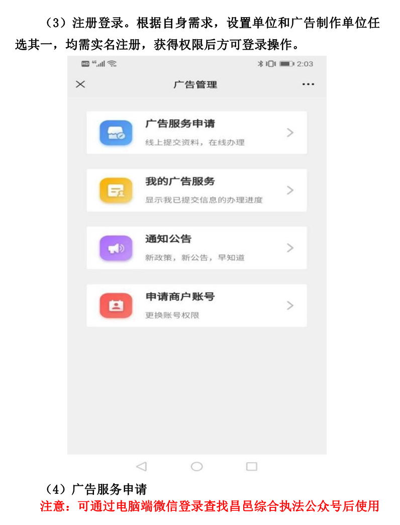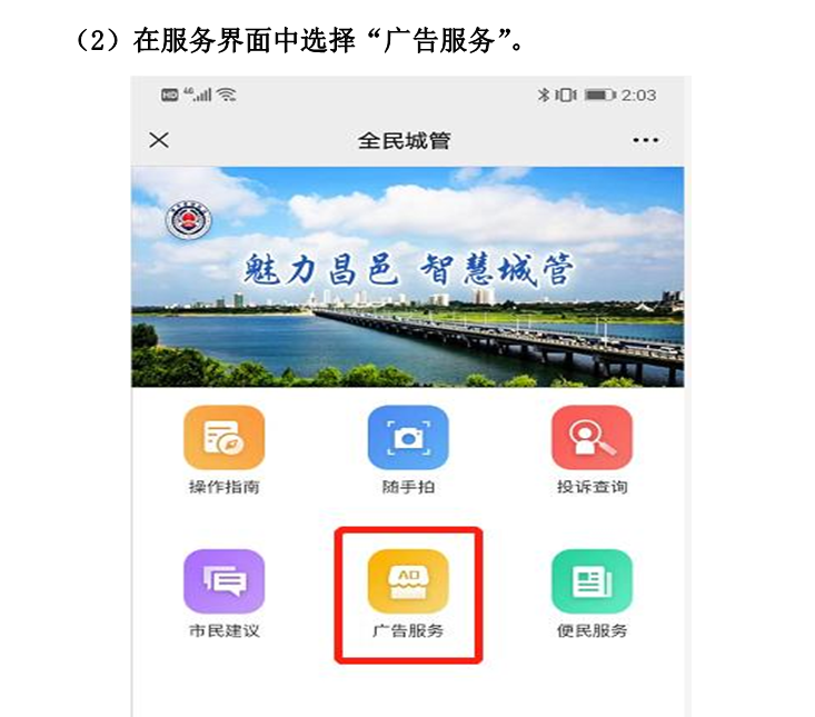 首页 行政动态 昌邑市户外新上更换门头招牌、广告牌在线办理指南 昌邑市户外新上更换门头招牌、广告牌在线办理指南 昌邑之窗 发布于 2022年4月18日 评论(0) 阅读(316) 为方便市民群众 落实疫情防控,坚持市民群众“少跑腿” 实现管理服务“零见面”,从今日(4月18日)起 新上或者更换广告牌可足不出户掌上办理了! 具体操作流程如下: