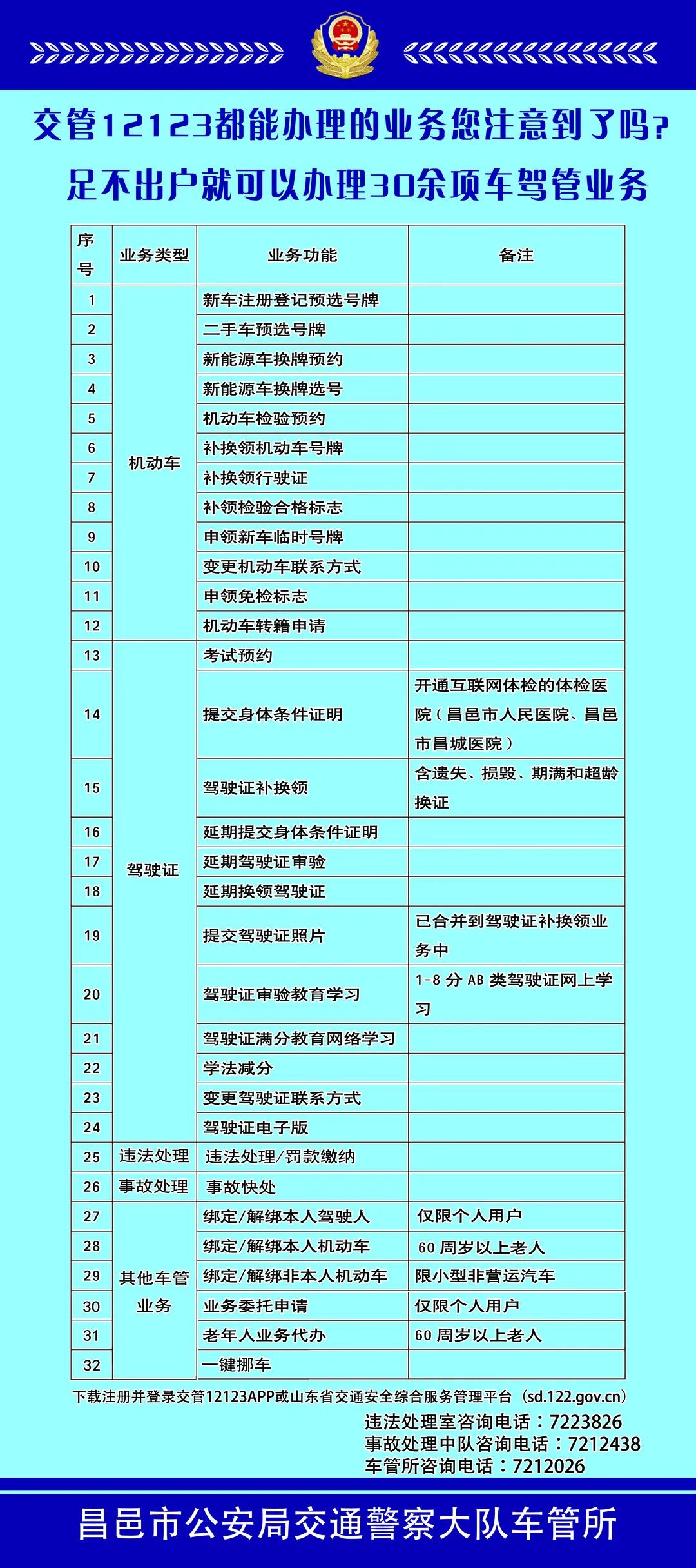 推出省内首家警银合作新模式!2022年昌邑市公安局依托“红蓝守护”平台把“交管12123”置入到农商行乡村振兴政银惠民服务平台,通过平台可以直接办理车驾管业务。每个网点内也有车驾管业务的展板,每名农金员都能办理“交管12123”APP上的网办业务,将网办和代办延伸到了全部村庄,真正让群众少跑腿,足不出户的办理了车驾管业务,提高了群众的满意度。