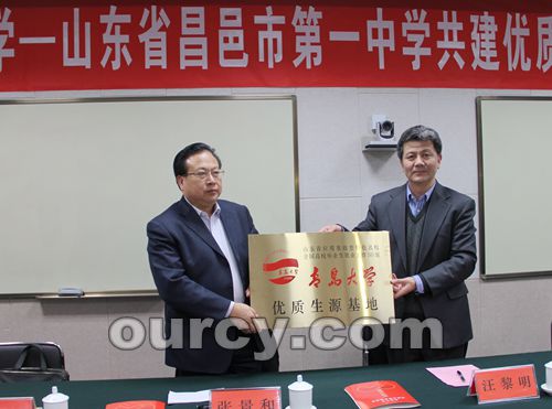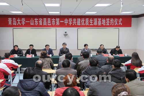 1月14日,“青岛大学与昌邑一中共建优质生源基地签约仪式”在我校录播教室举行,青岛大学校党委书记、副校长汪黎明等四位专家教授,昌邑市教育局局长赵赞江,昌邑一中校长张景和、党委书记伊胜广等校领导及部分教职工和学生出席了签约仪式。