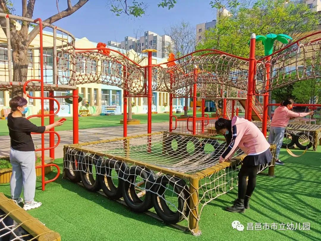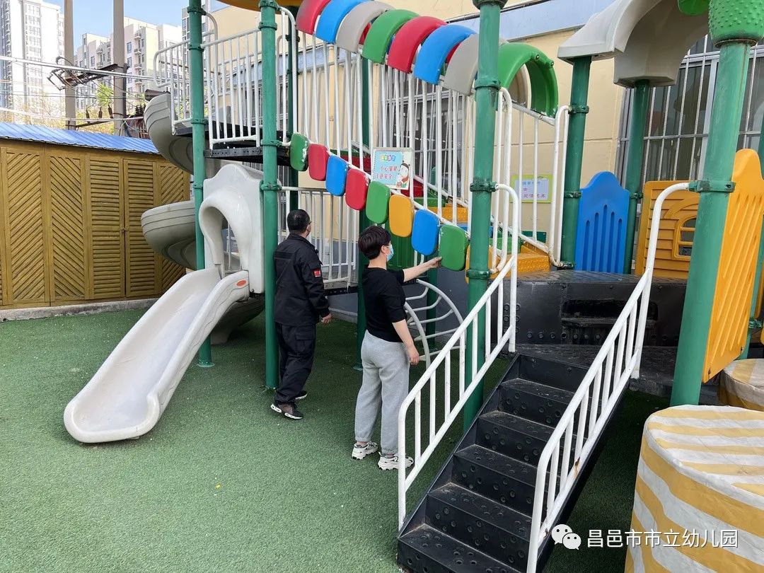 对幼儿园户外大型活动器械进行了全面、严格、细致的检查,确认器械的表面及内部有无损坏,零件有无破损、松动,确保复学后小朋友们能在爱的花园里尽情地释放快乐。