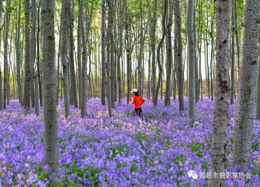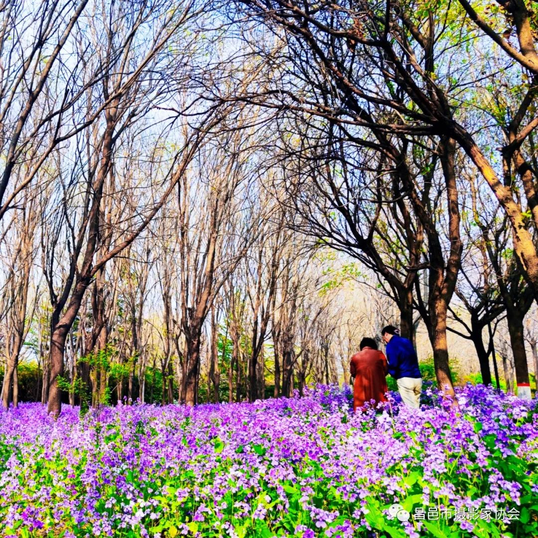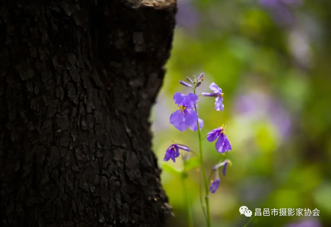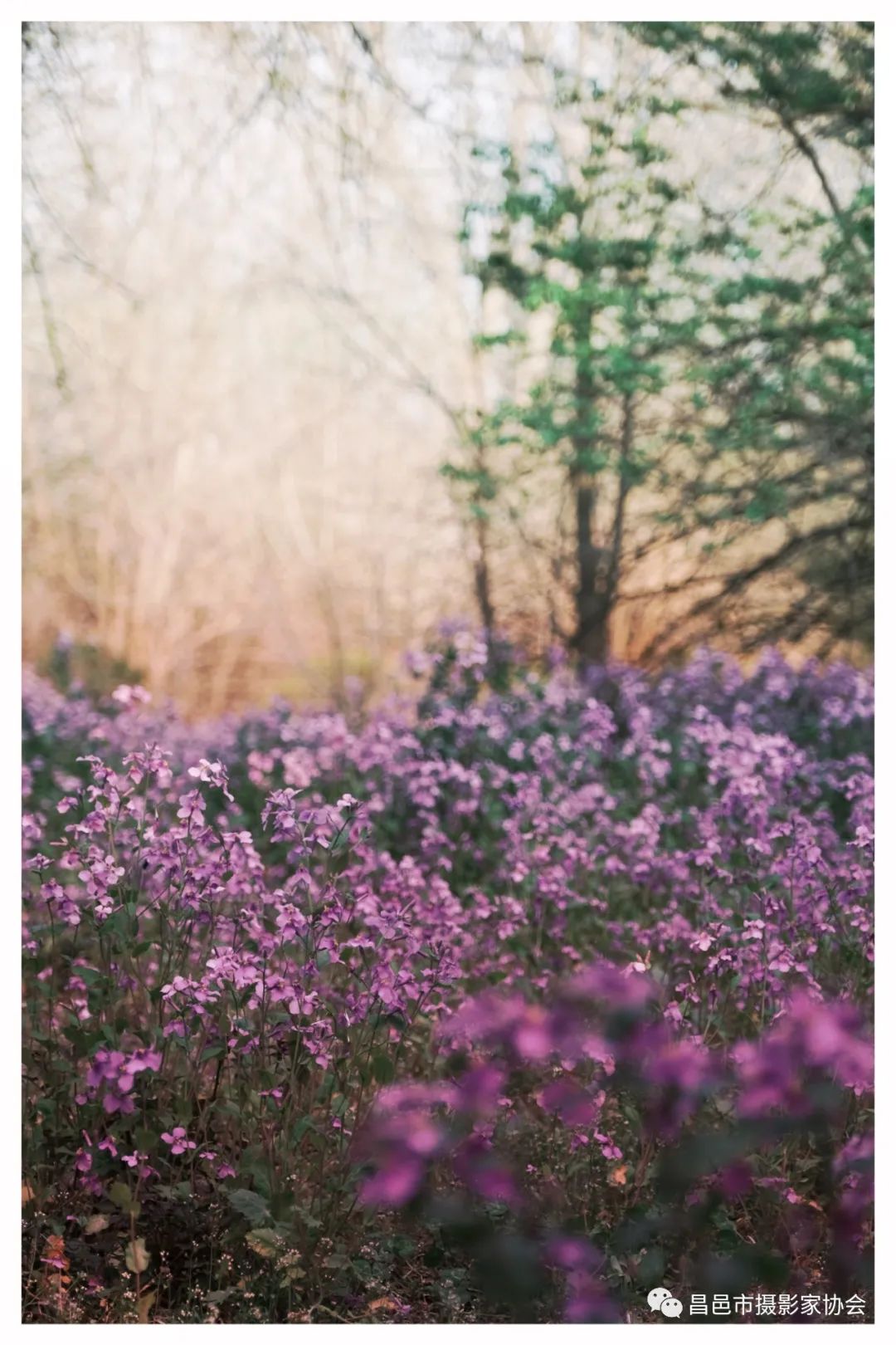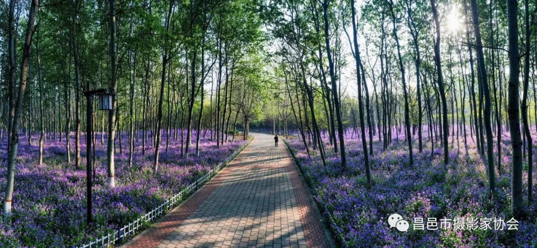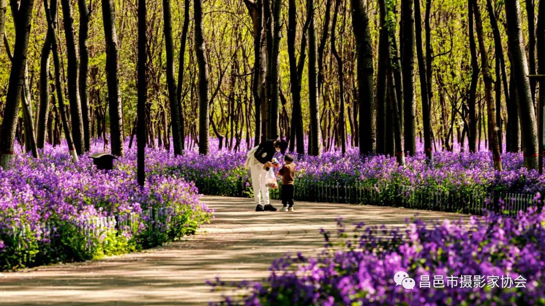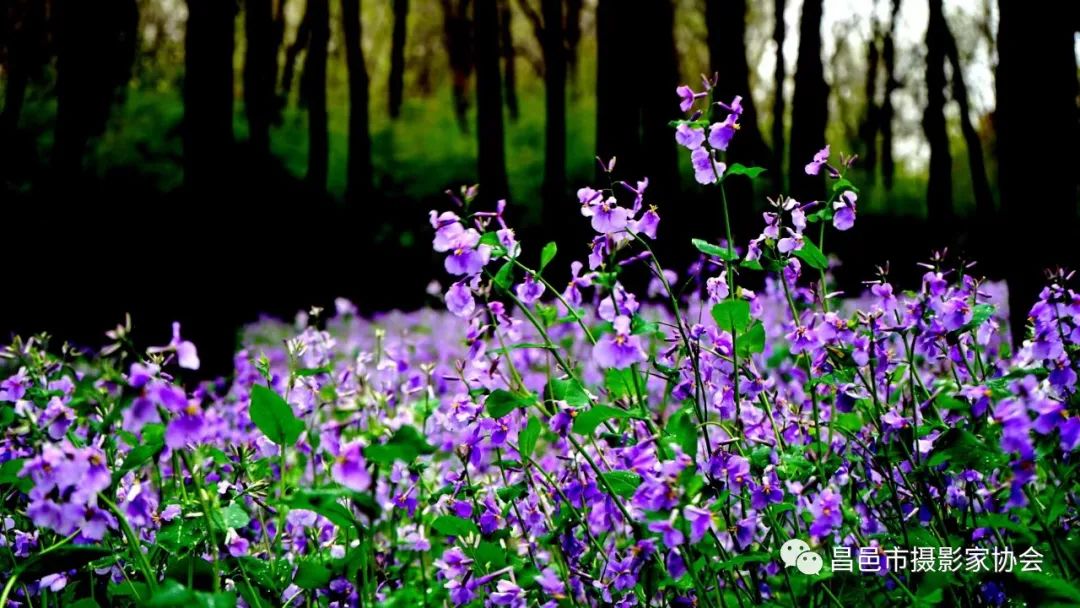 河岸的树下生长着一簇簇二月兰,顺着河堤向上攀援,在微风中汇成一片蓝紫色的立体景观。