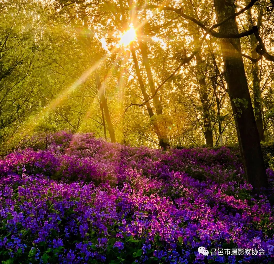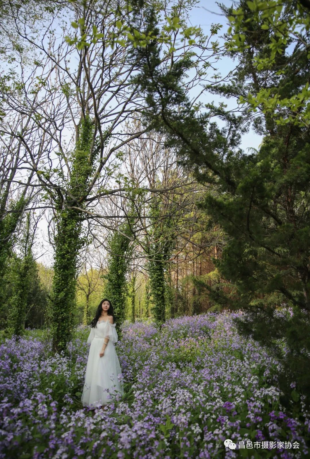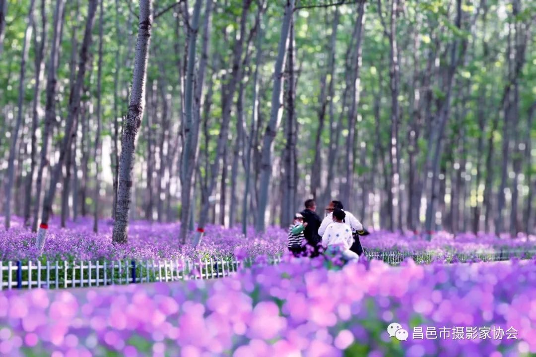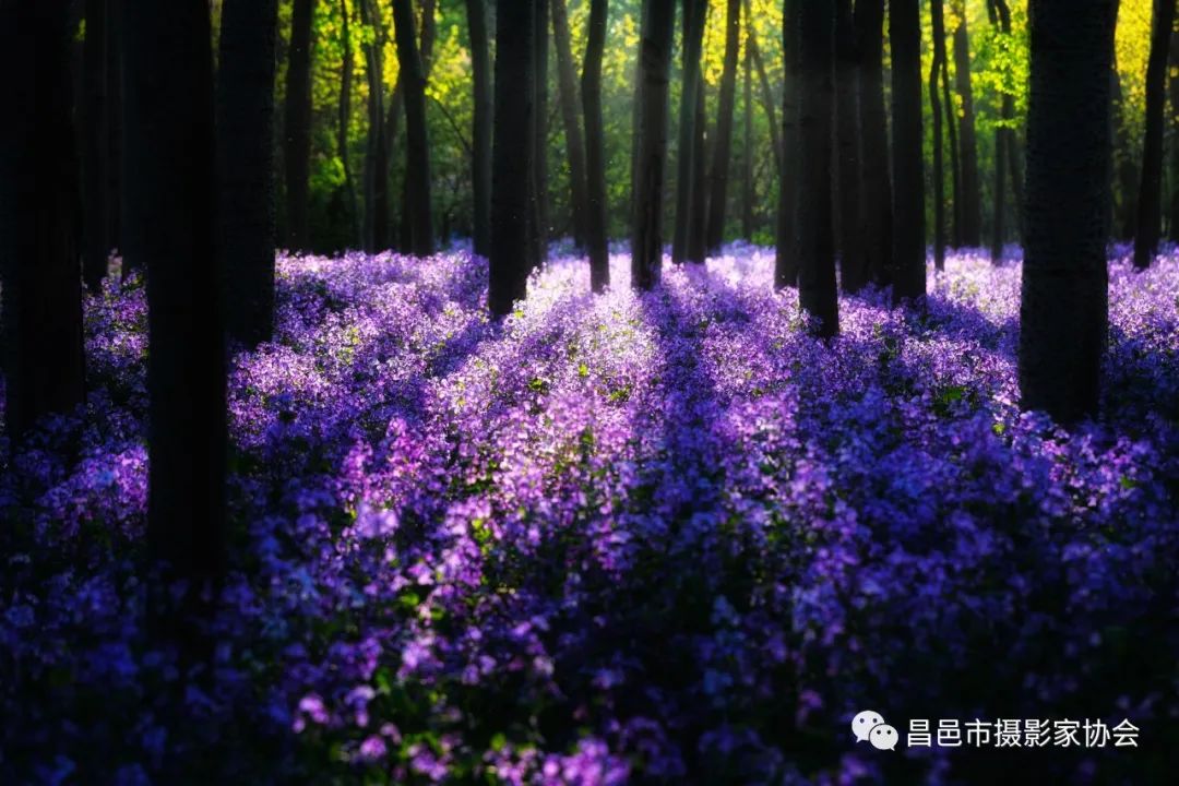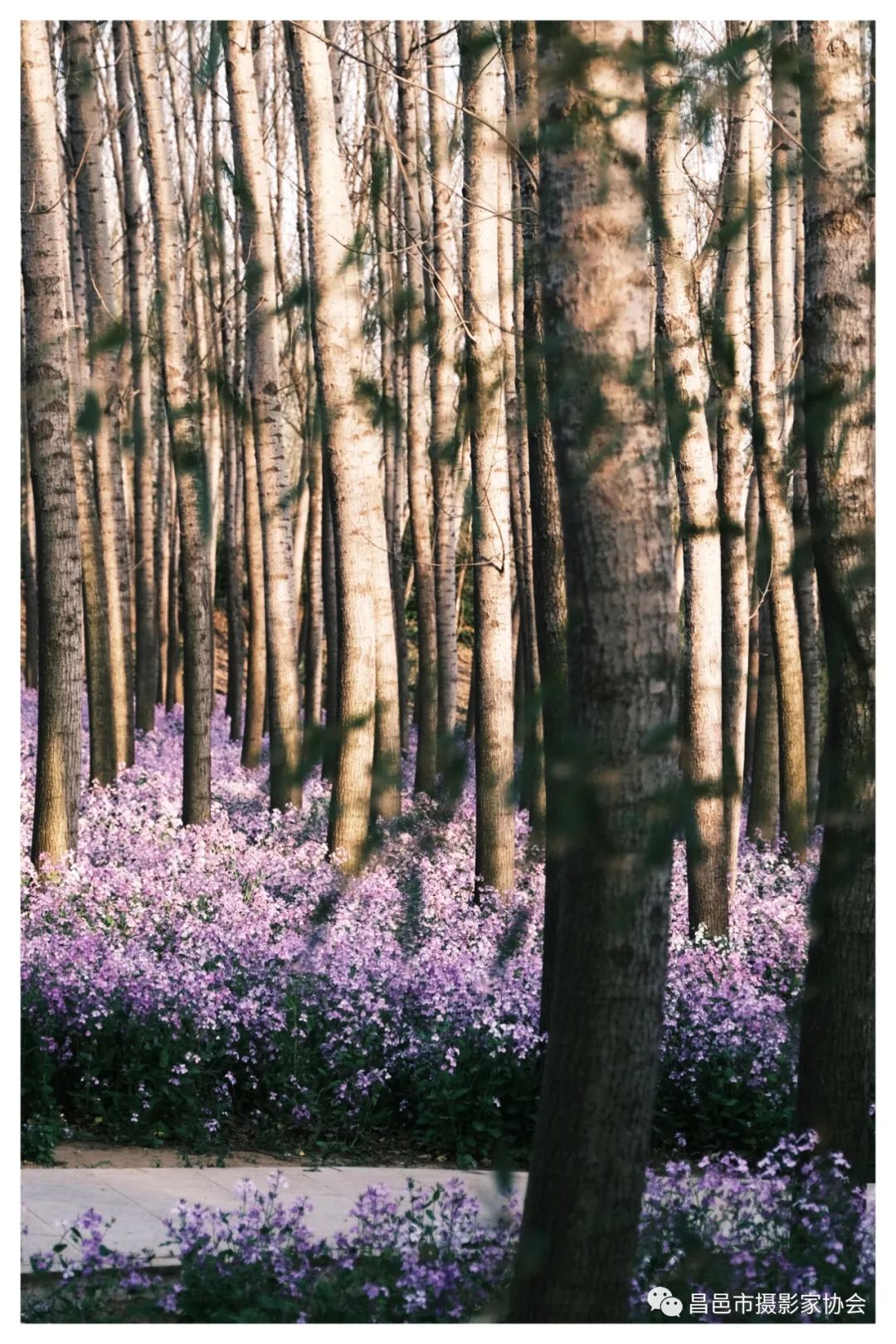 河岸的树下生长着一簇簇二月兰,顺着河堤向上攀援,在微风中汇成一片蓝紫色的立体景观。