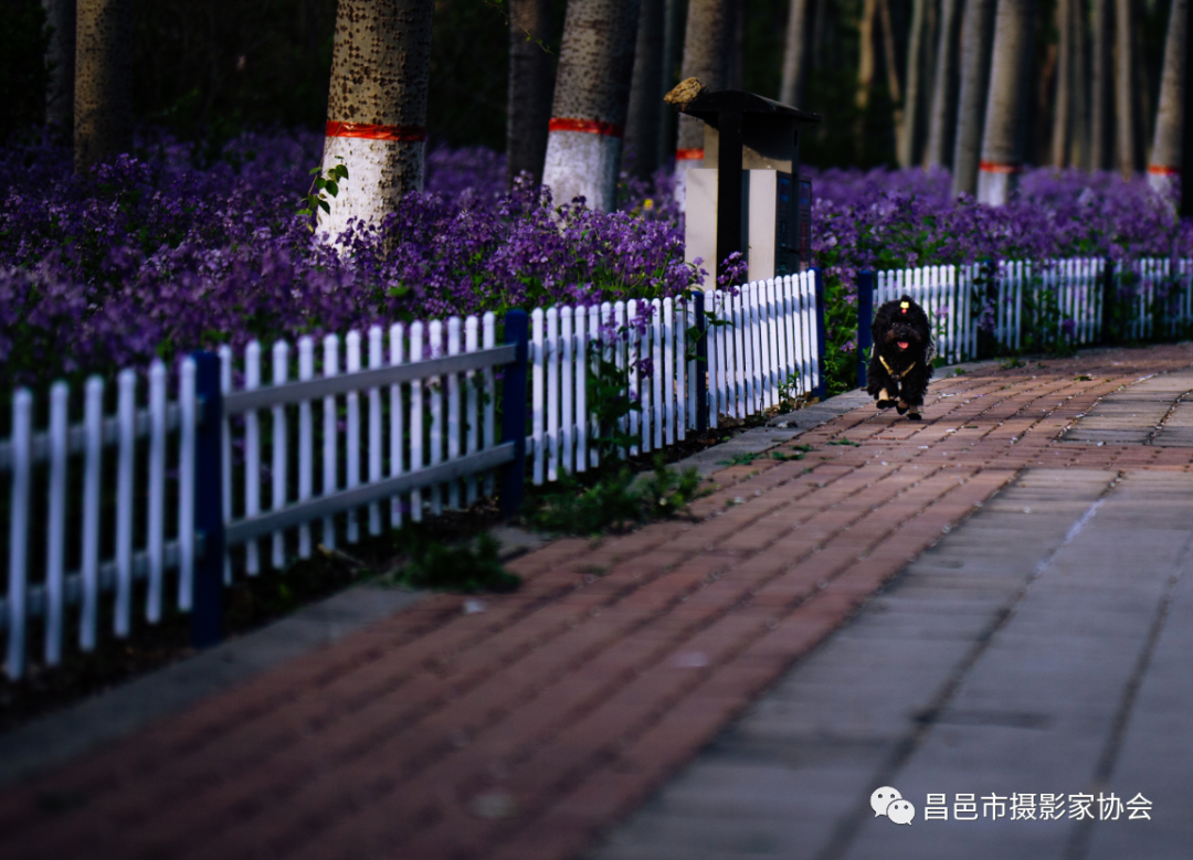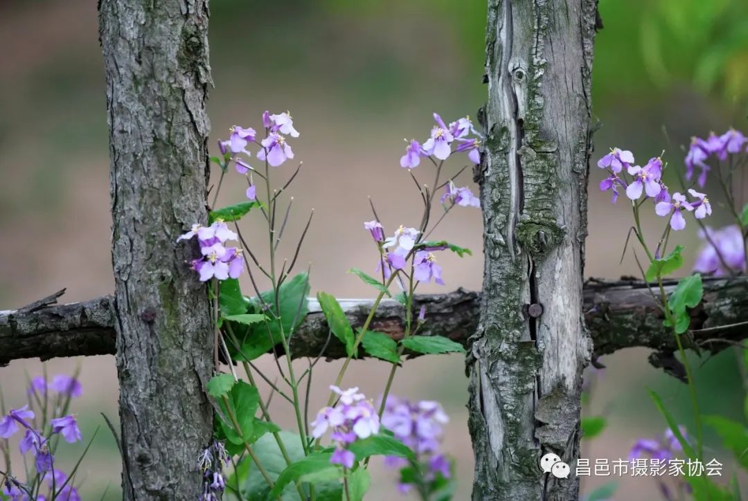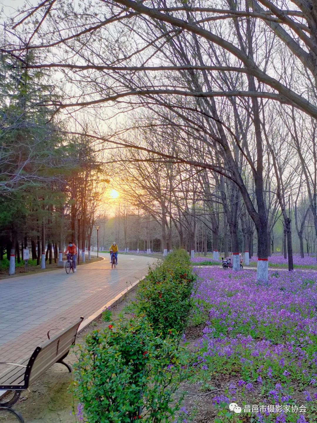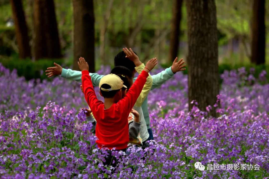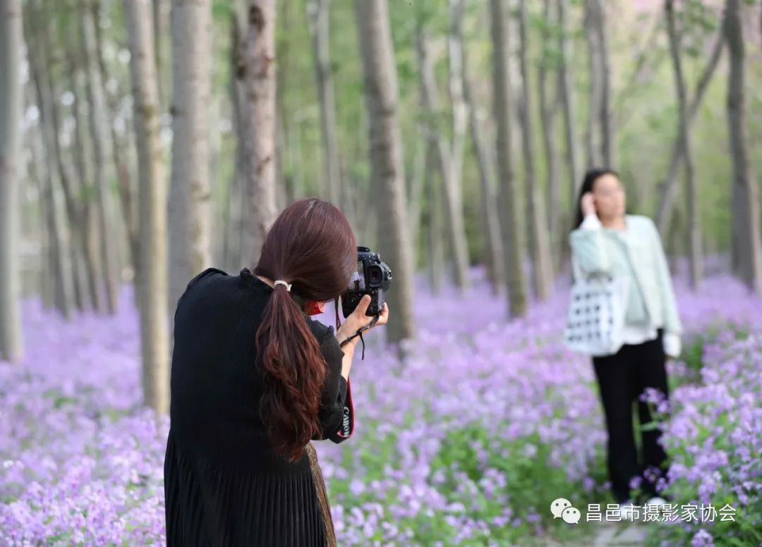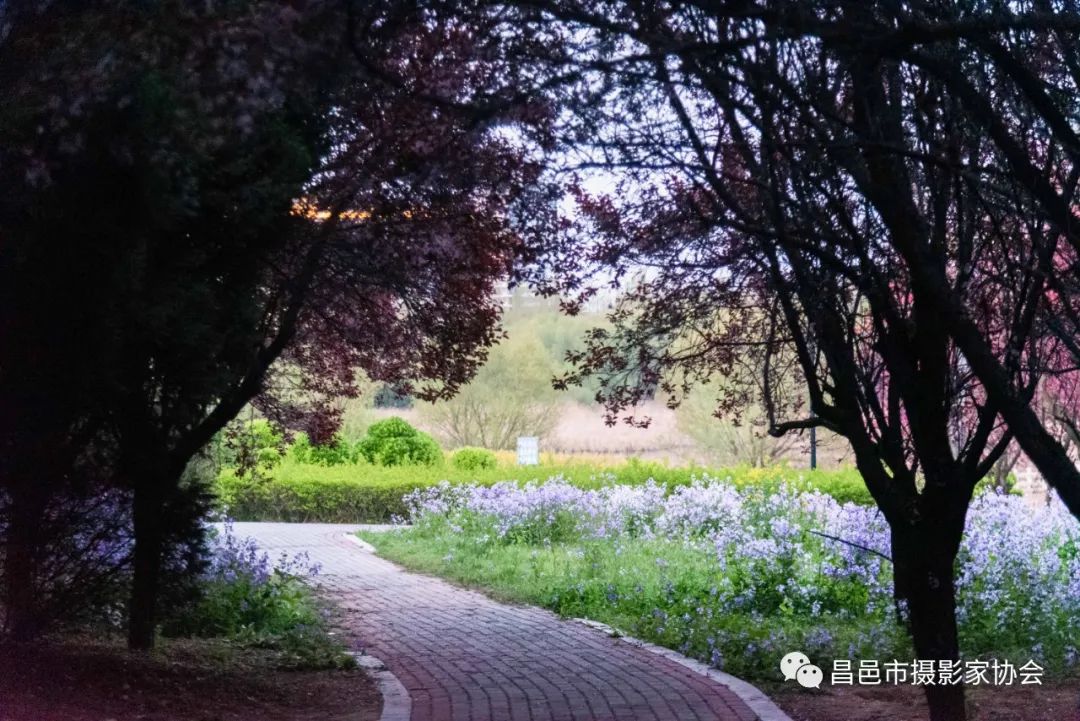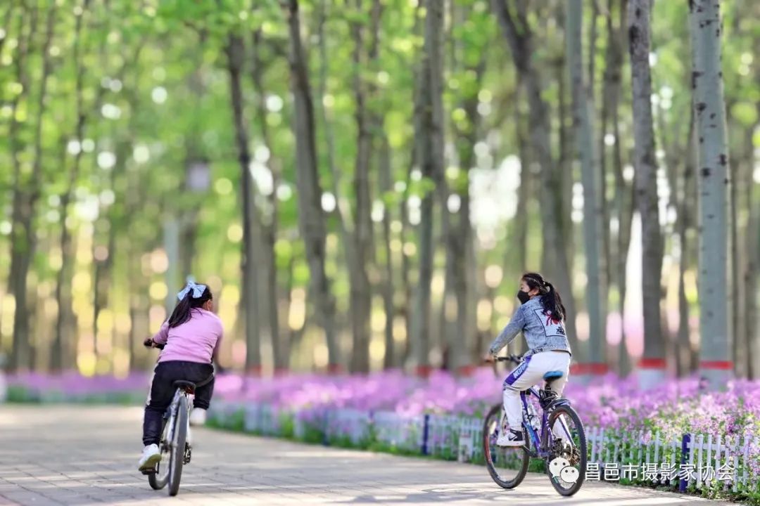 河岸的树下生长着一簇簇二月兰,顺着河堤向上攀援,在微风中汇成一片蓝紫色的立体景观。