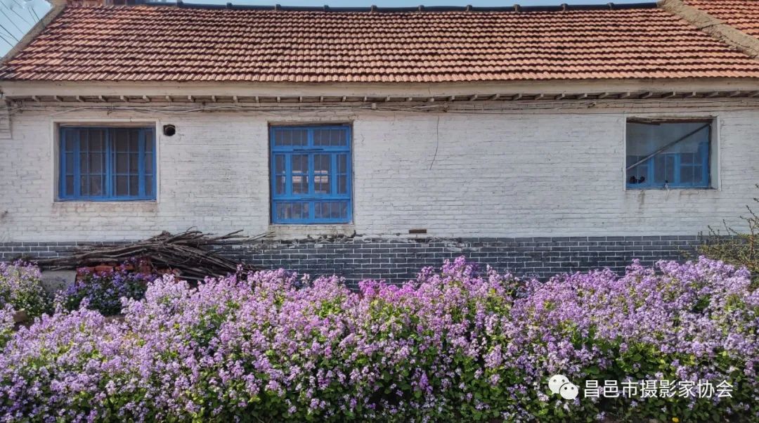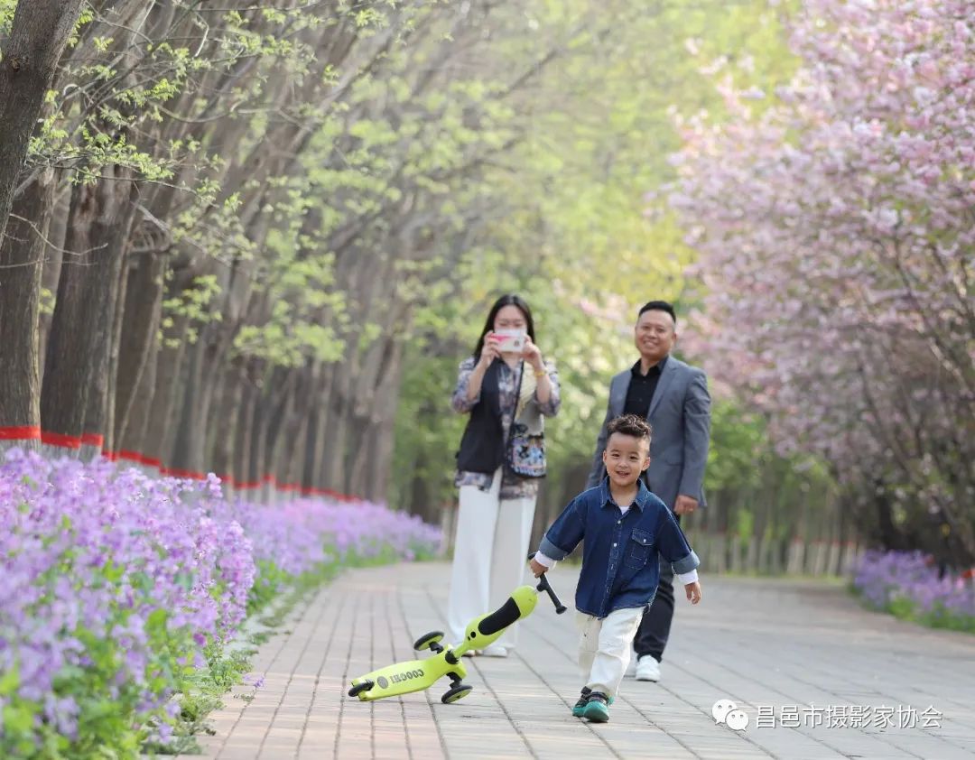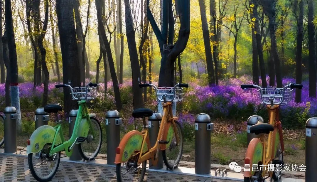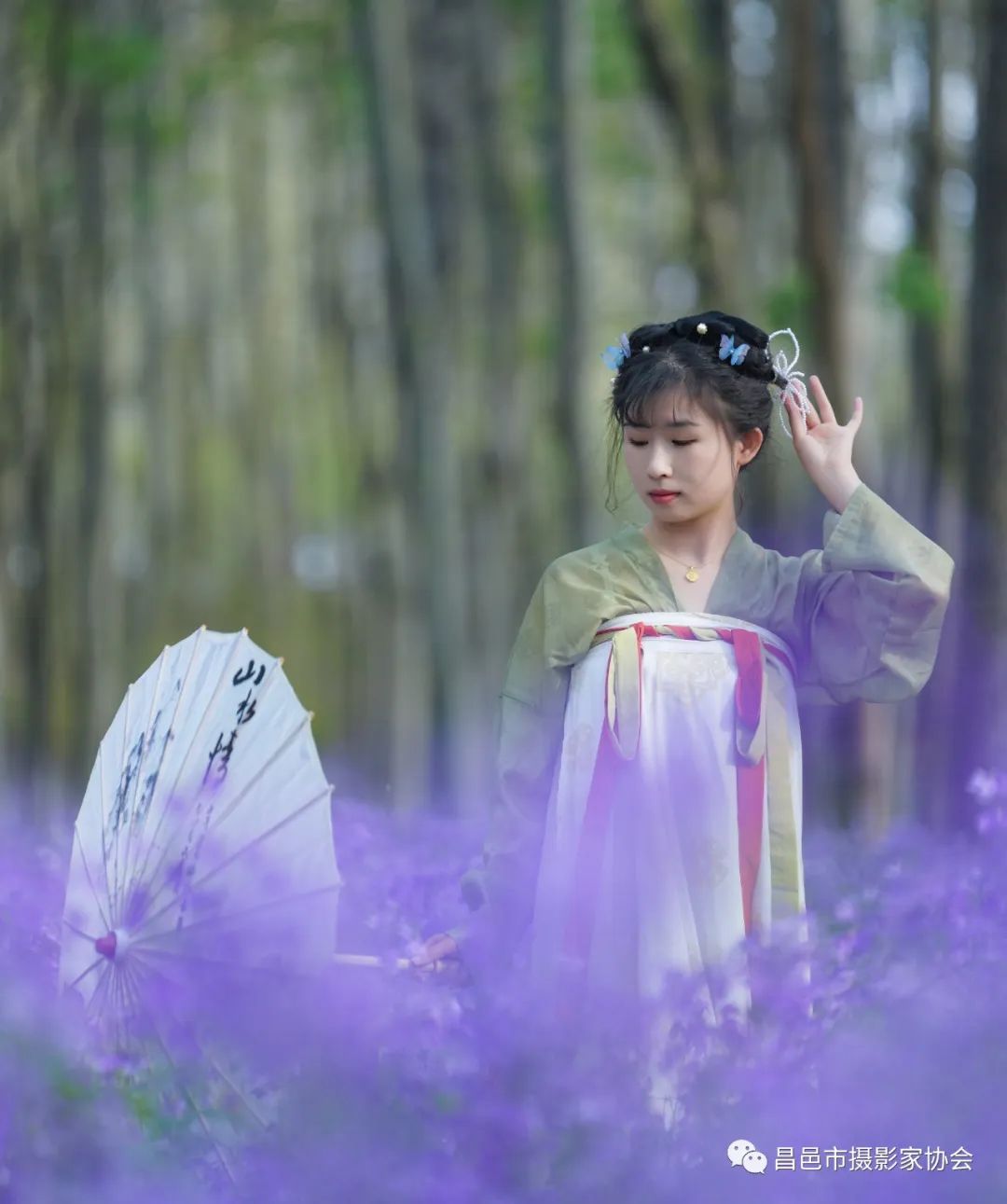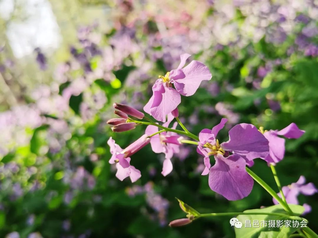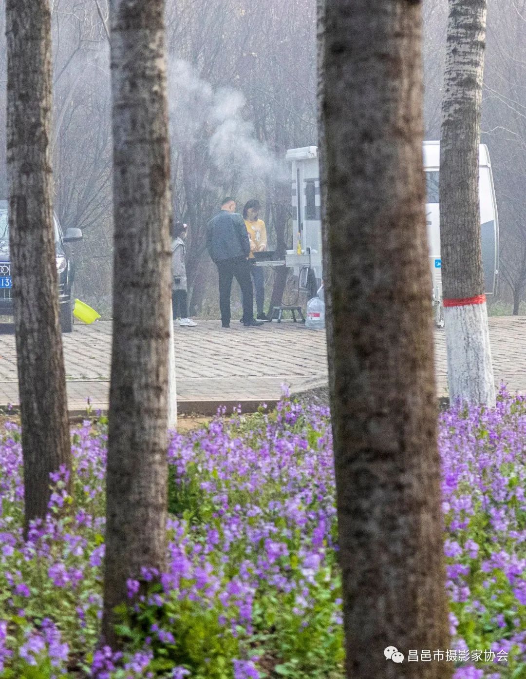 河岸的树下生长着一簇簇二月兰,顺着河堤向上攀援,在微风中汇成一片蓝紫色的立体景观。