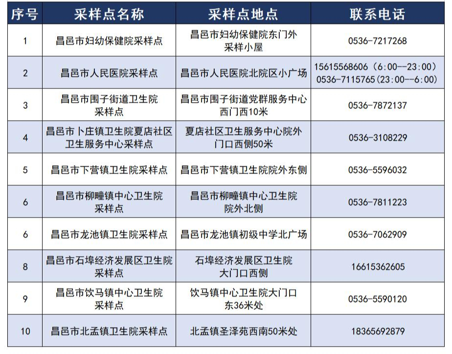 根据当前疫情防控工作需要,为方便昌邑市民就近及时核酸采样检测,现将我市24小时服务“愿检尽检”采样点名单公布如下:昌邑市 24小时服务“愿检尽检”采样点名单