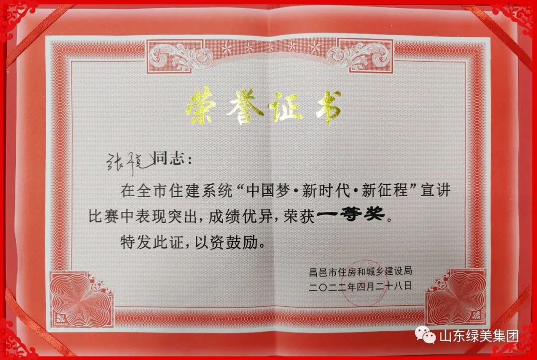 2022年4月28日,昌邑市住房和城乡建设局举行“中国梦·新时代·新征程”宣讲比赛,经过2个多小时的激烈角逐,绿美集团职工代表张悦以《以担当书写忠诚 用奋斗诠释热爱》为题,凭借自身的雄厚实力和出色表现,最终从15名选手中脱颖而出,荣获本次比赛一等奖。