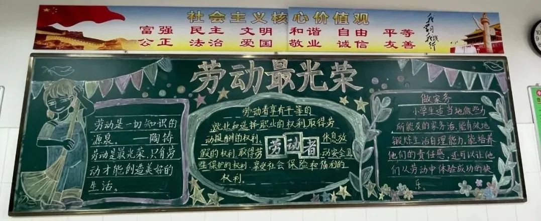 学校加强校园文化建设,通过办黑板报的形式在潜移默化中培养少先队员们尊重每一位劳动者的意识,培养队员们热爱劳动珍惜劳动果实的好习惯。