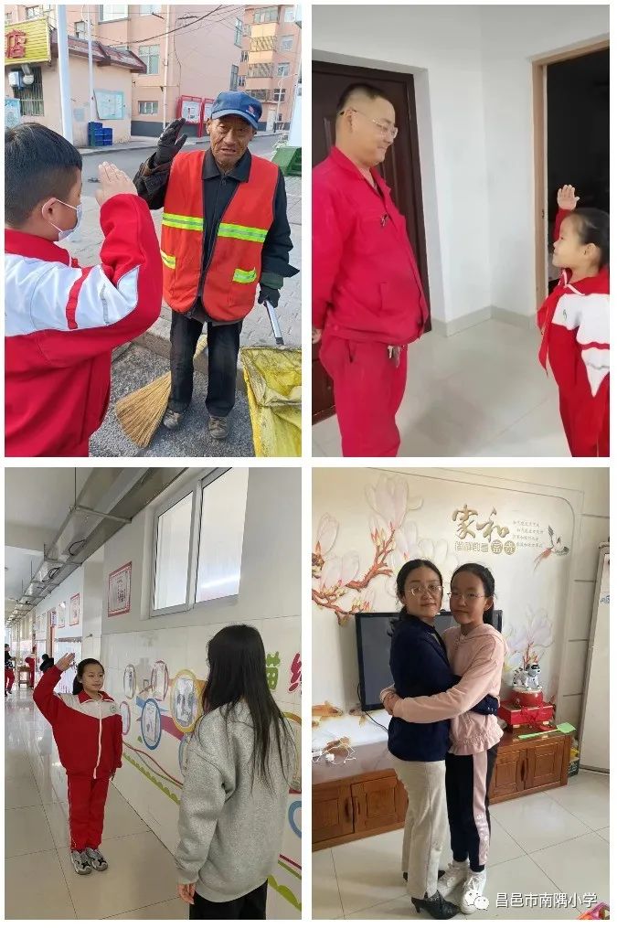 除了劳动模范,身边的很多人也是默默付出的最美劳动者,如父母、社区的普通劳动者、或者其他行业人员。南隅小学队员们自制一朵花、一张卡片、用一个拥抱、一个队礼等多种形式致敬身边的劳动者,用照片和视频的方式记录这一感动时刻。