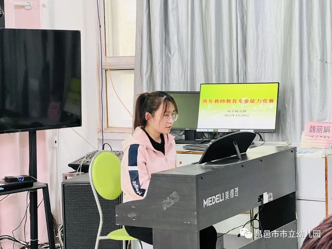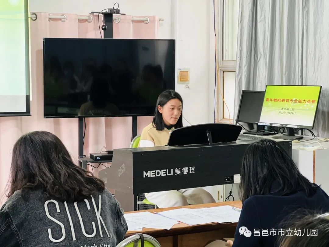 在弹唱环节中,教师现场抽签弹唱一首儿童歌曲,优美的旋律在黑白键上欢快地游荡,动听的歌声在耳畔萦绕。老师娴熟的演唱,行云流水的弹奏,使得空气中仿佛闪动着跳跃的音符。