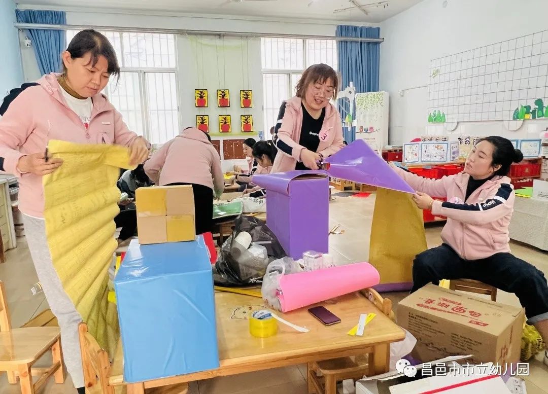老师们精心构思、用心制作,将废旧纸盒、饮料瓶、罐子等材料变废为宝,经过一双双巧手变成了给孩子们带来知识和快乐的宝物。