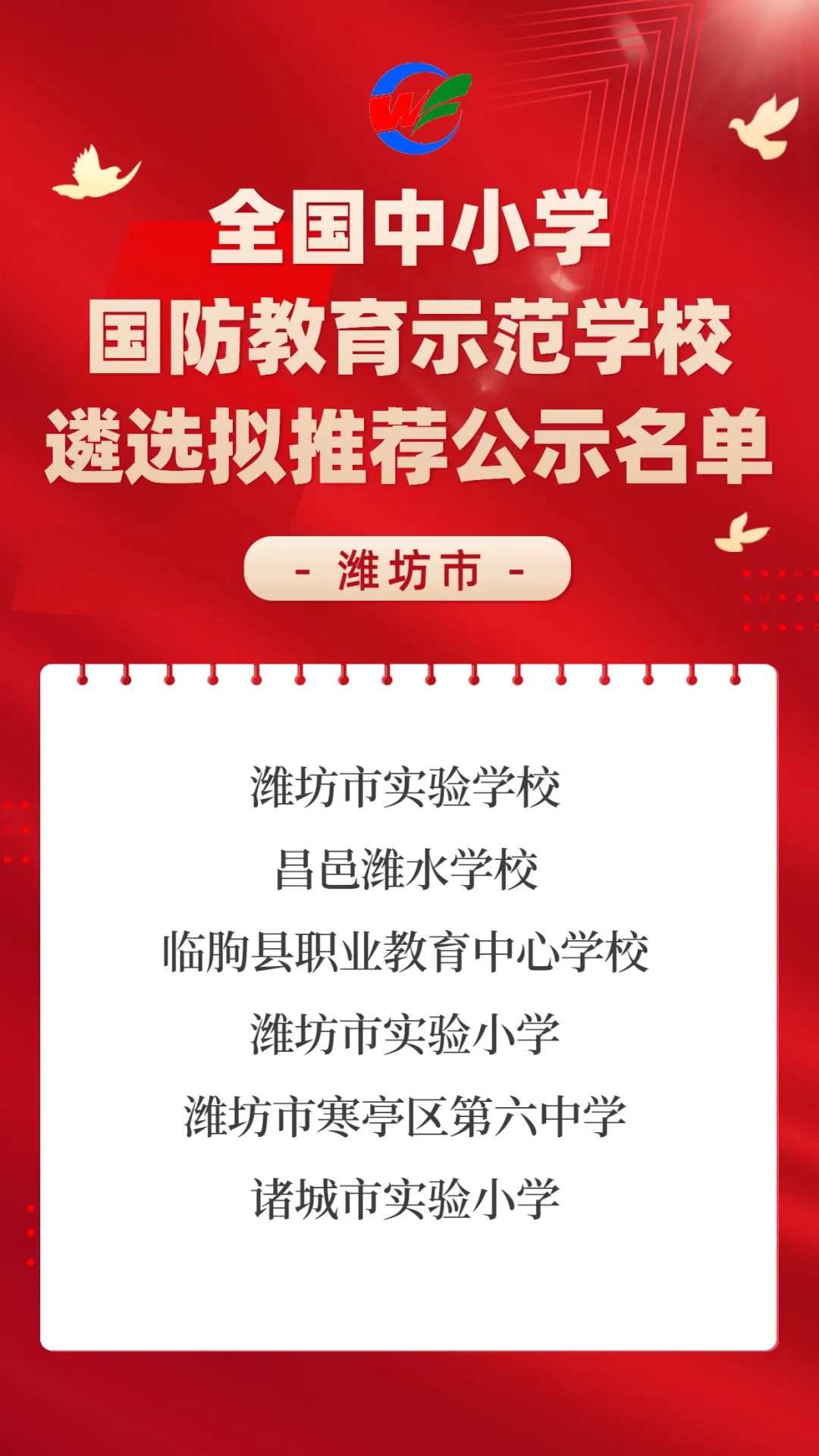 首页 行政动态 昌邑潍水学校拟获全国中小学国防教育示范学校称号 昌邑潍水学校拟获全国中小学国防教育示范学校称号 昌邑之窗 发布于 2022年5月3日 评论(0) 阅读(593) 近日,省教育厅发布《关于全国中小学国防教育示范学校遴选拟推荐名单的公示》,经学校自主申报、县(市、区)考察、市级初审、省级评审等程序,全省遴选83所学校拟推荐创建2021年全国中小学国防教育示范学校,其中我市潍坊市实验学校、昌邑潍水学校、临朐县职业教育中心学校、潍坊市实验小学、潍坊市寒亭区第六中学、诸城市实验小学入选拟推荐名单。 来源:潍坊教育发布