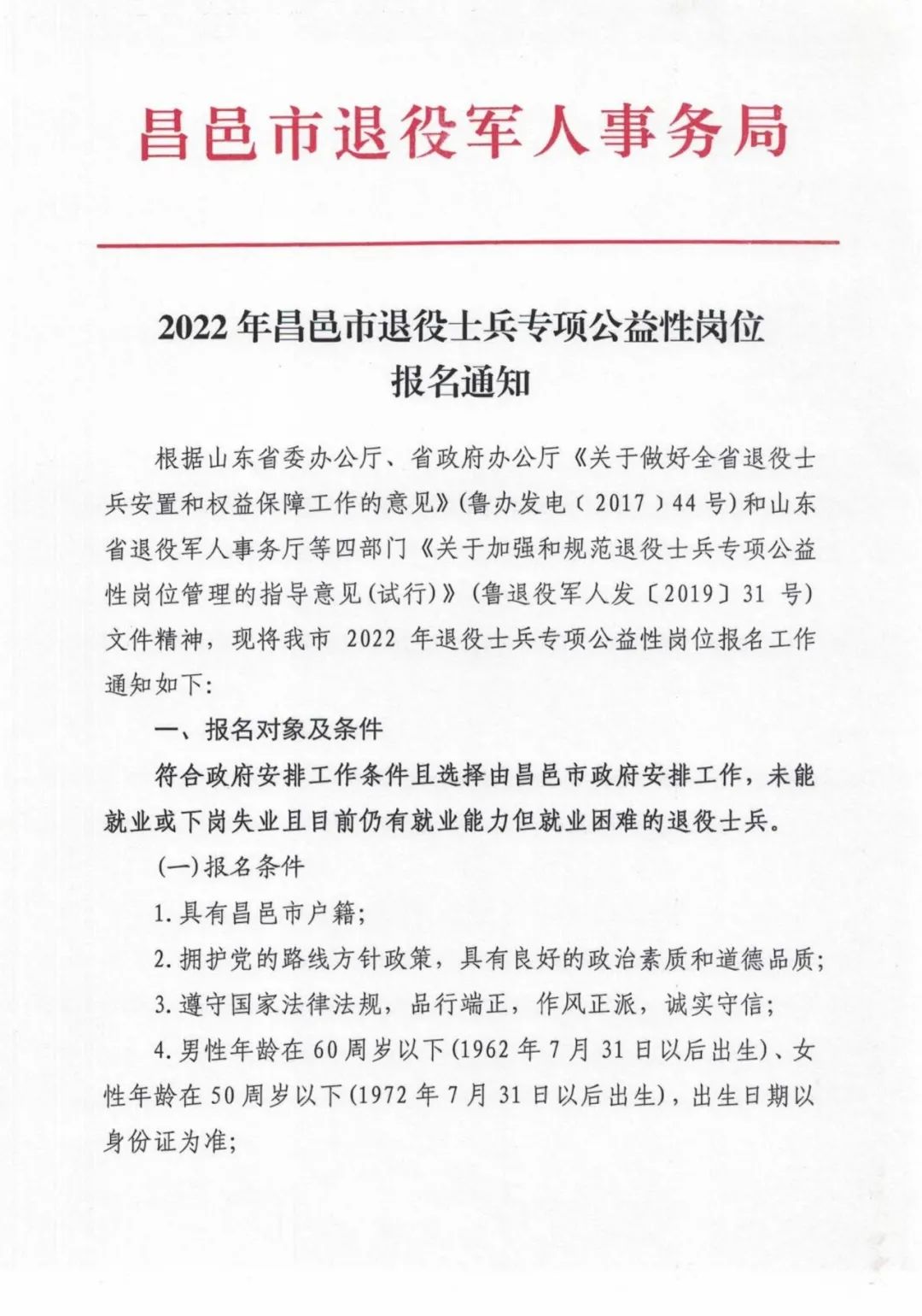 根据山东省委办公厅、省政府办公厅《关于做好全省退役士兵安置和权益保障工作的意见》(鲁办发电(2017)44号)和山东省退役军人事务厅等四部门《关于加强和规范退役士兵专项公益性岗位管理的指导意见(试行)》(鲁退役军人发[2019]31号)文件精神,现将我市2022年退役士兵专项公益性岗位报名工作通知如下:
