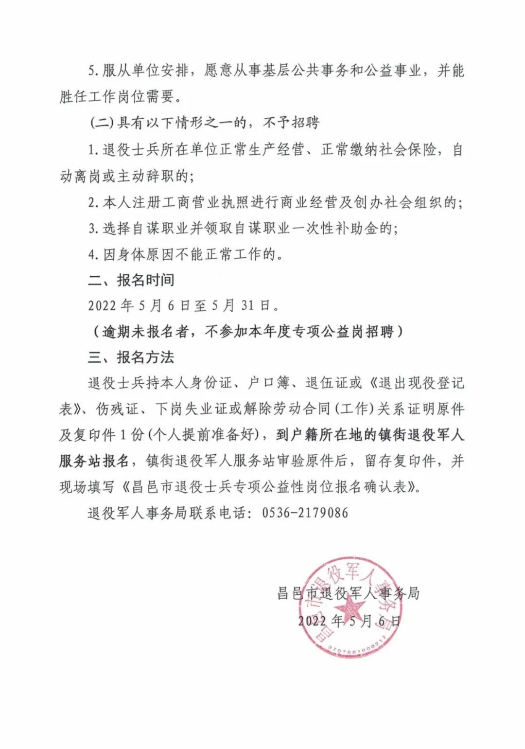 2022年昌邑市退役士兵专项公益性岗位报名通知